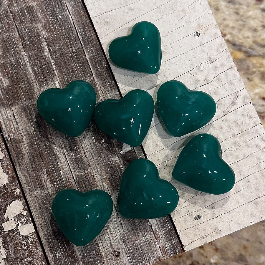 Great stocking stuffer! Beautifully vibrant, Green Glass Puffy Hearts - a heart-warming sentiment without uttering a word. They offer a powerful expression of love that can be used: as a party favor, decoration, secretly left behind for your love to find, slip in a pocket, have a bunch displayed in a dish, or added to any gift. They are opaque with a vibrant kelly-green hue, typical of blown glass. These Puffy Hearts measures approximately 1"x 1" x 3/4"