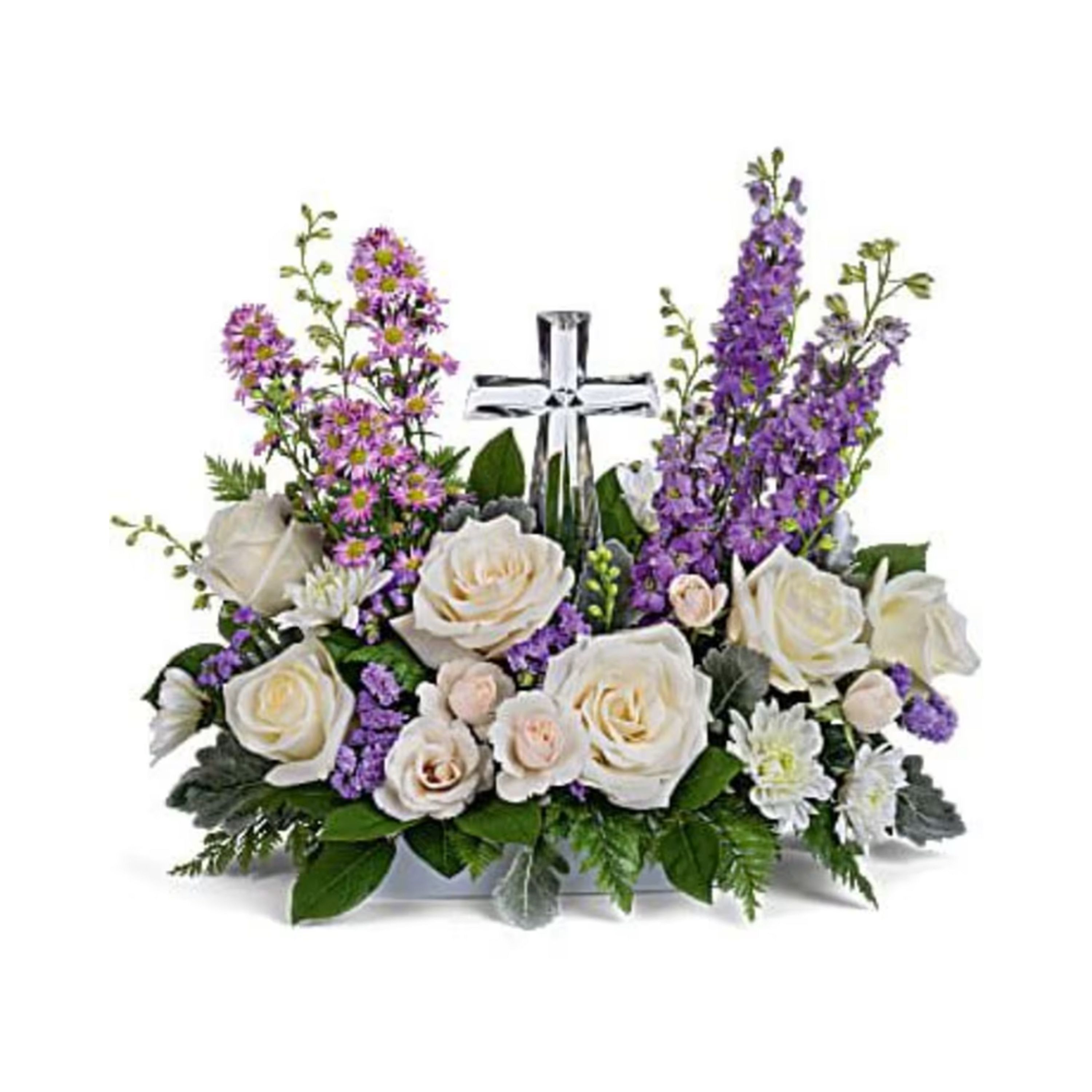 Soft and serene, this artistic array of cream and lavender blooms around a radiant crystal cross keepsake is a heartfelt expression of love..