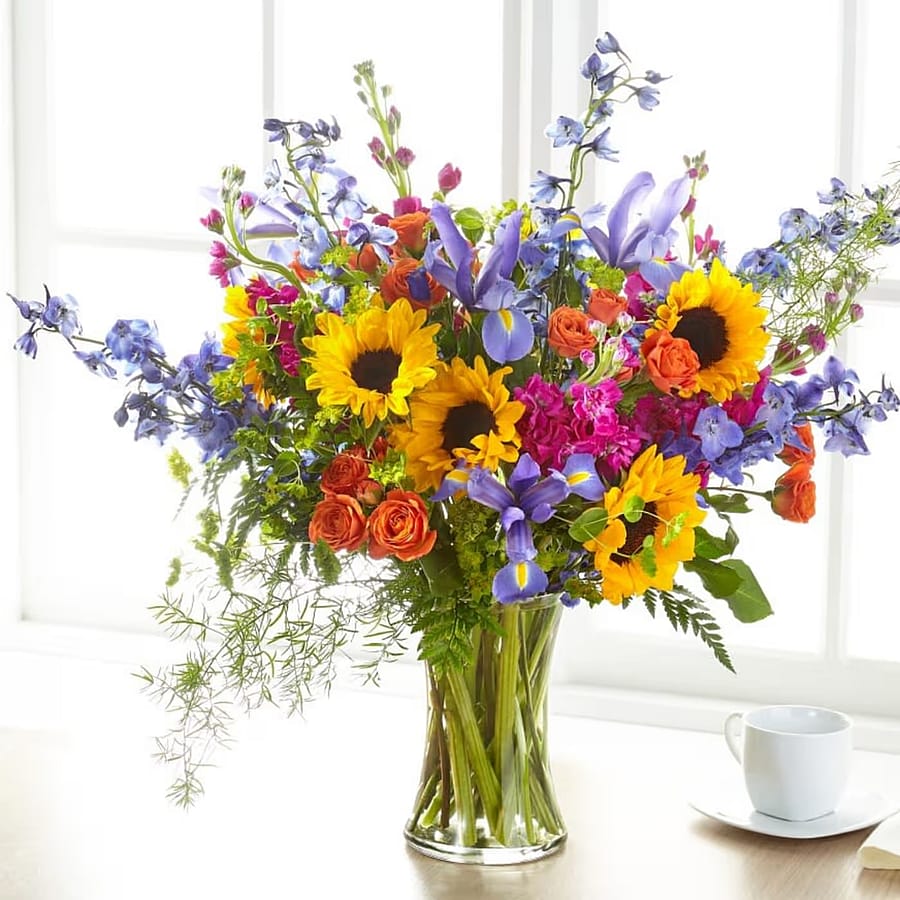 Show your loved ones how much you care about them with a beautiful bouquet full of vibrant florals. Our Rays of Light Bouquet arrives handcrafted by a local florist with sunflowers, iris, stock and delphinium to offer your comfort. While this bouquet is stunning in size, if is best to be placed on a small table, or within in a home or residence.