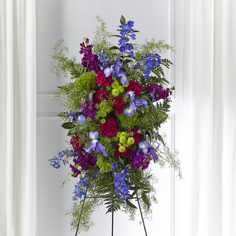 Vibrant life Standing Spray is crafted with a beautiful blend of stock, iris, dianthus and delphinium reminiscent of a hopeful wildflower garden.