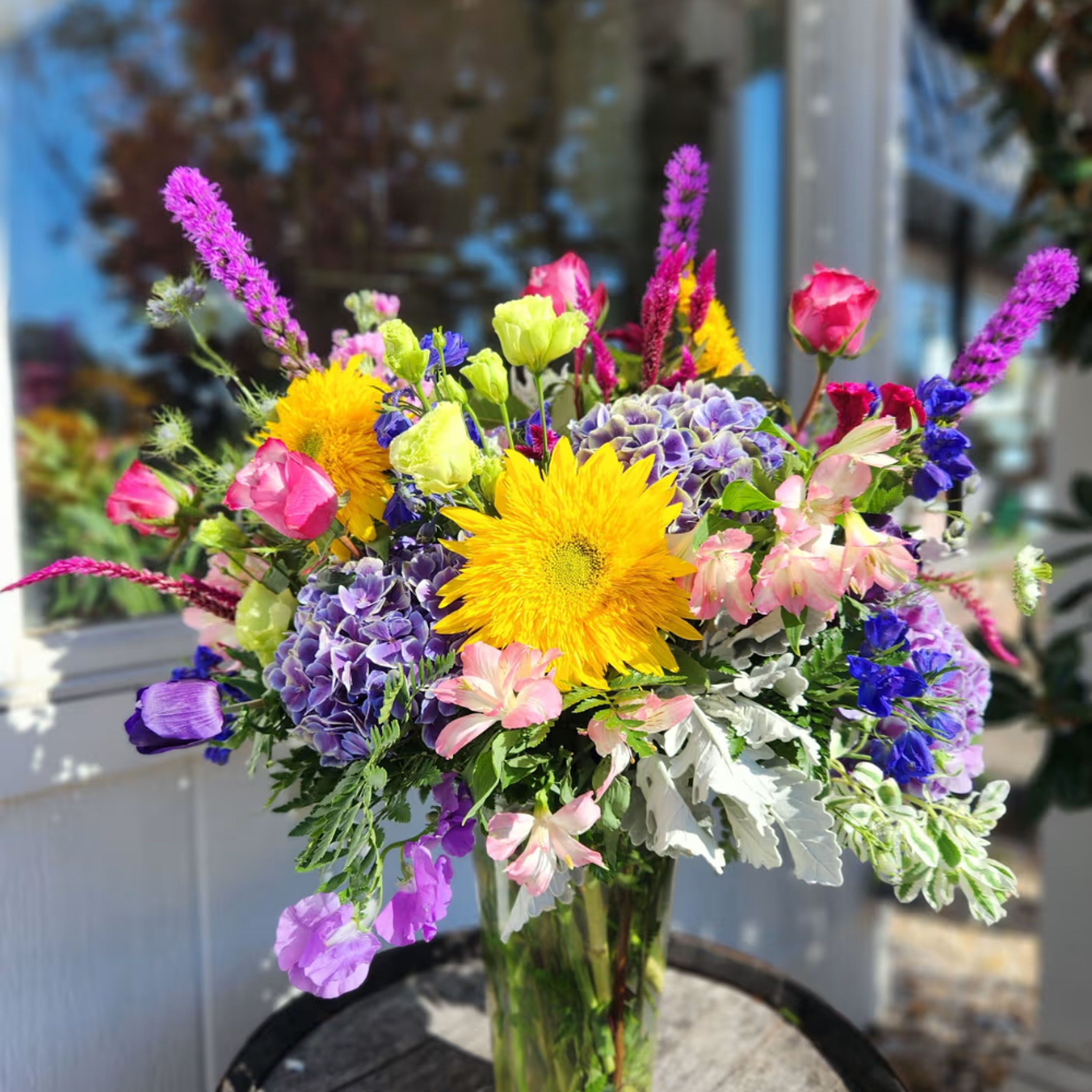 Product Information This arrangement features Teddy bear sunflowers, liatris, delphinium, roses and hydrangeas in a clear vase! Substitution Policy In some instances, our photo may represent an overall theme or look and include a one-of-a-kind vase which cannot be exactly replicated. Although the actual bouquet may not precisely match the photo, its temperament will. Occasionally, substitutions of flowers and/or containers happen due to weather, seasonality and market conditions which may affect availability. If this is the case with the gift you’ve selected, we will ensure that the style, theme and color scheme of your arrangement is preserved and will only substitute items of equal value or higher value. If any design elements are of major importance to your order, please include them in the florist instructions at checkout or contact us to ensure availability.