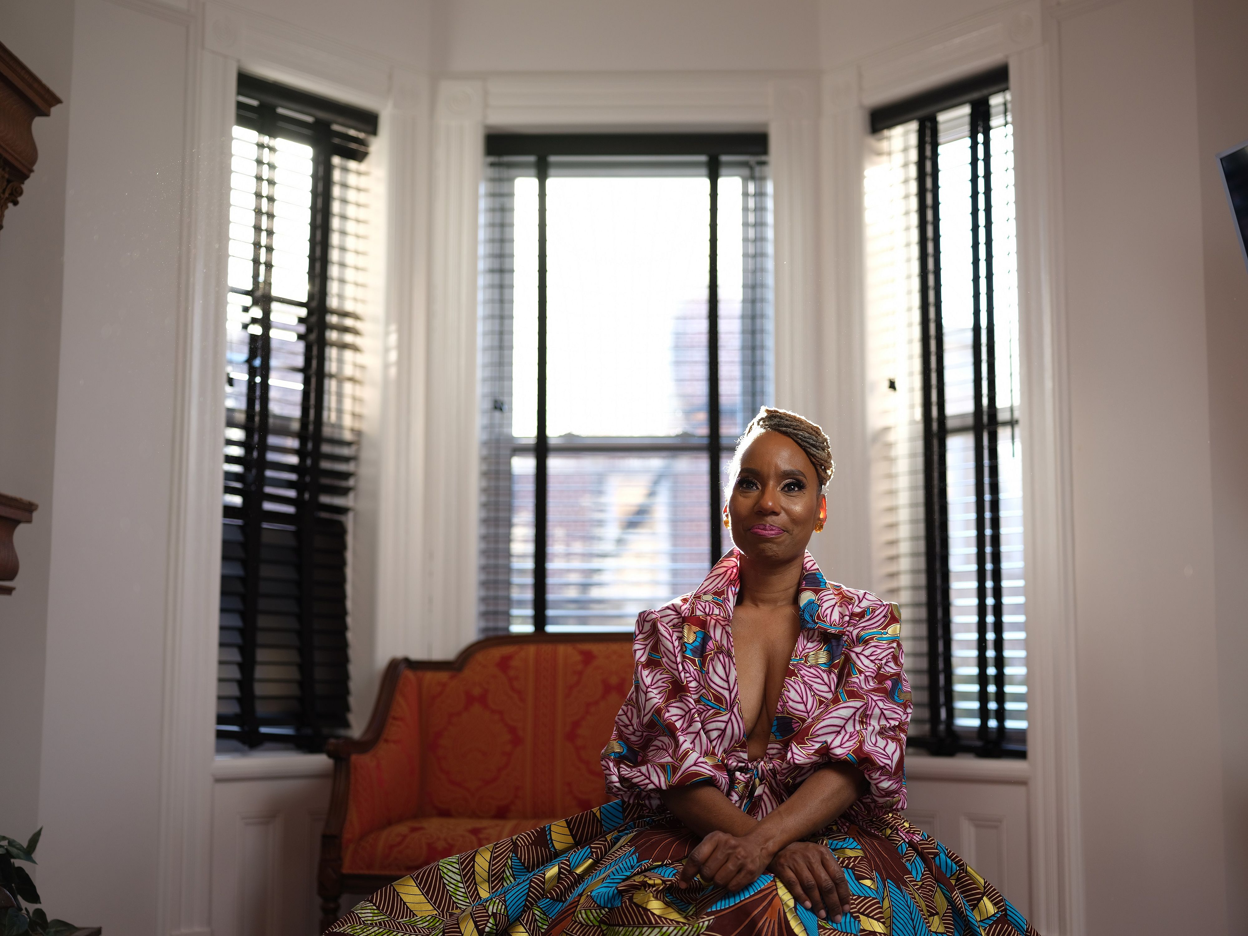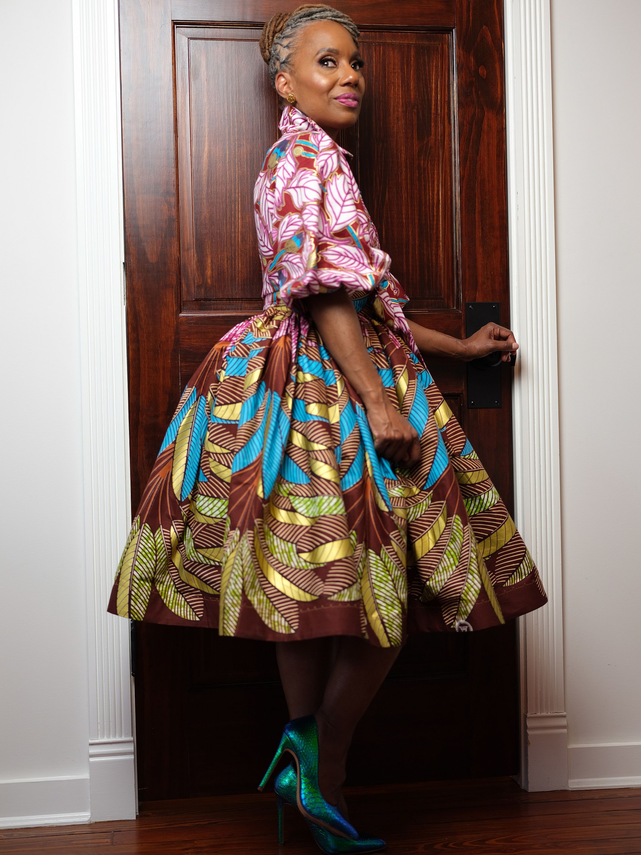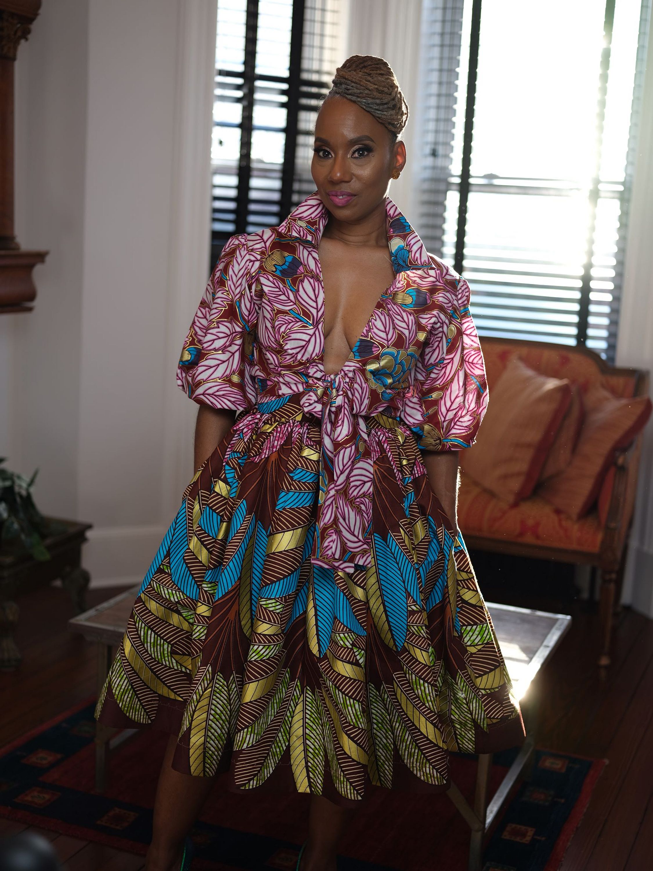 Neema top is made from metallic African wax, plunging neckline with a collar, 3/4 puff sleeve, modest crop with tie front.