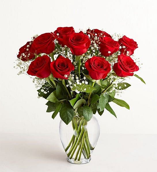A timeless expression of love, celebration, or appreciation. This elegant arrangement features one dozen premium roses artfully designed in a clear glass vase and accented with lush greenery and delicate filler flowers. To add texture and fullness, the bouquet also includes 2–3 complementary accent stems, creating a beautifully balanced, garden-inspired look.