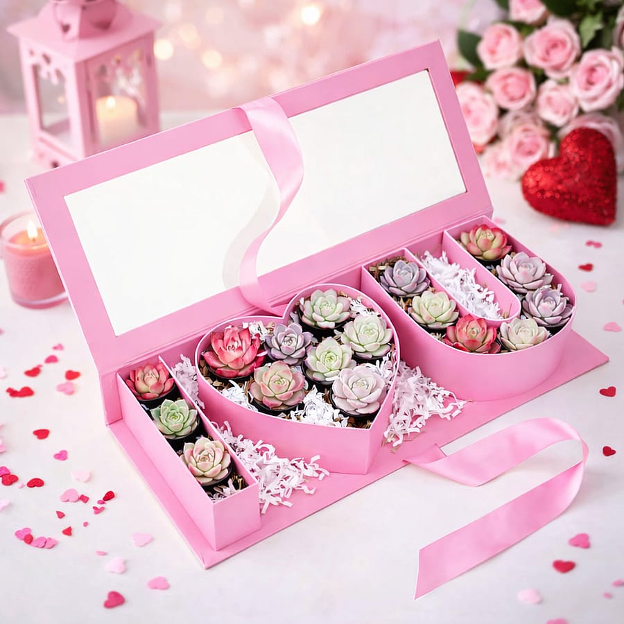 Gift beautiful rosette echeveria succulents in a unique I LOVE YOU box. Succulents are long lasting and easy to care for. You can plant these in your favorite pot after gifting. Only water 1x a month and give lots of window sunlight. If outdoors make sure its spring, summer or early fall. Succulents cannot survive outdoors during winters as they are a desert plant. This is a unique gift that anyone would love for Valentines Day or Mothers Day!
