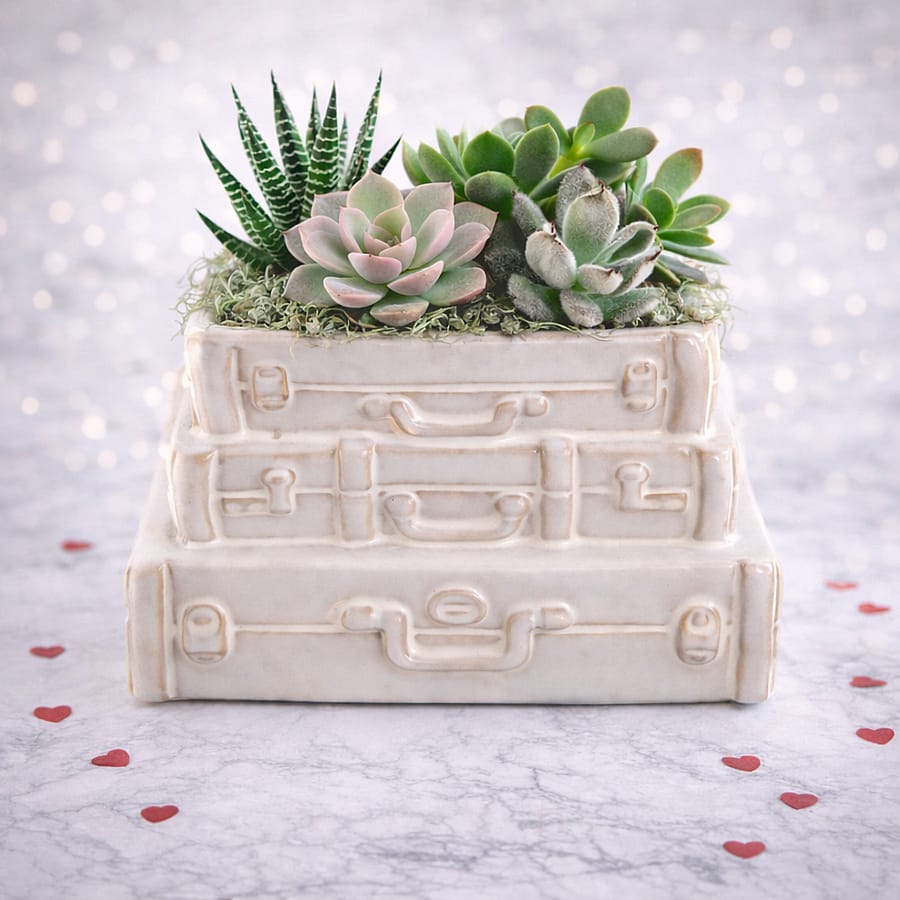 Succulent arrangement for anyone who loves traveling. Would look great in a home or office space. This is a heavy duty ceramic planter of stacked suitcases, glazed white filled with premium succulents.