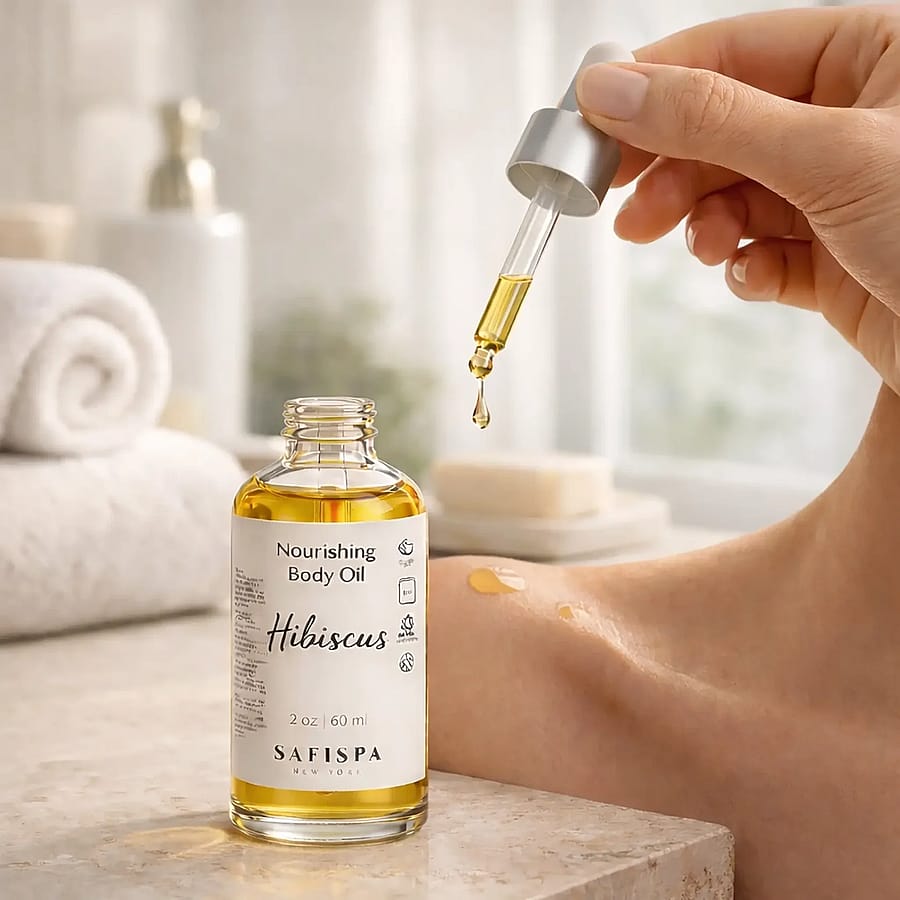 SaFiSpa Hibiscus Body Oil luxury spa lifestyle scene on marble vanity with warm natural light and premium skincare aesthetic.