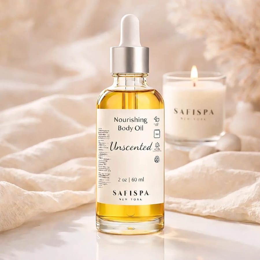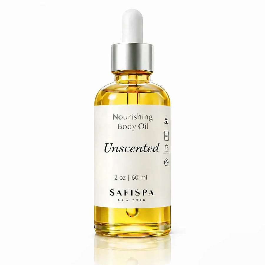 SaFiSpa Unscented Body Oil is a fragrance-free body oil designed for daily body care, soft-skin routines, and lightweight post-shower hydration. This fast-absorbing body oil blends grapeseed oil, sunflower seed oil, jojoba oil, and vitamin E to help skin feel smooth, comfortable, moisturized, and never heavy. Created for those who want clean, minimal body care with a silky finish that layers beautifully with lotion, body butter, or perfume.