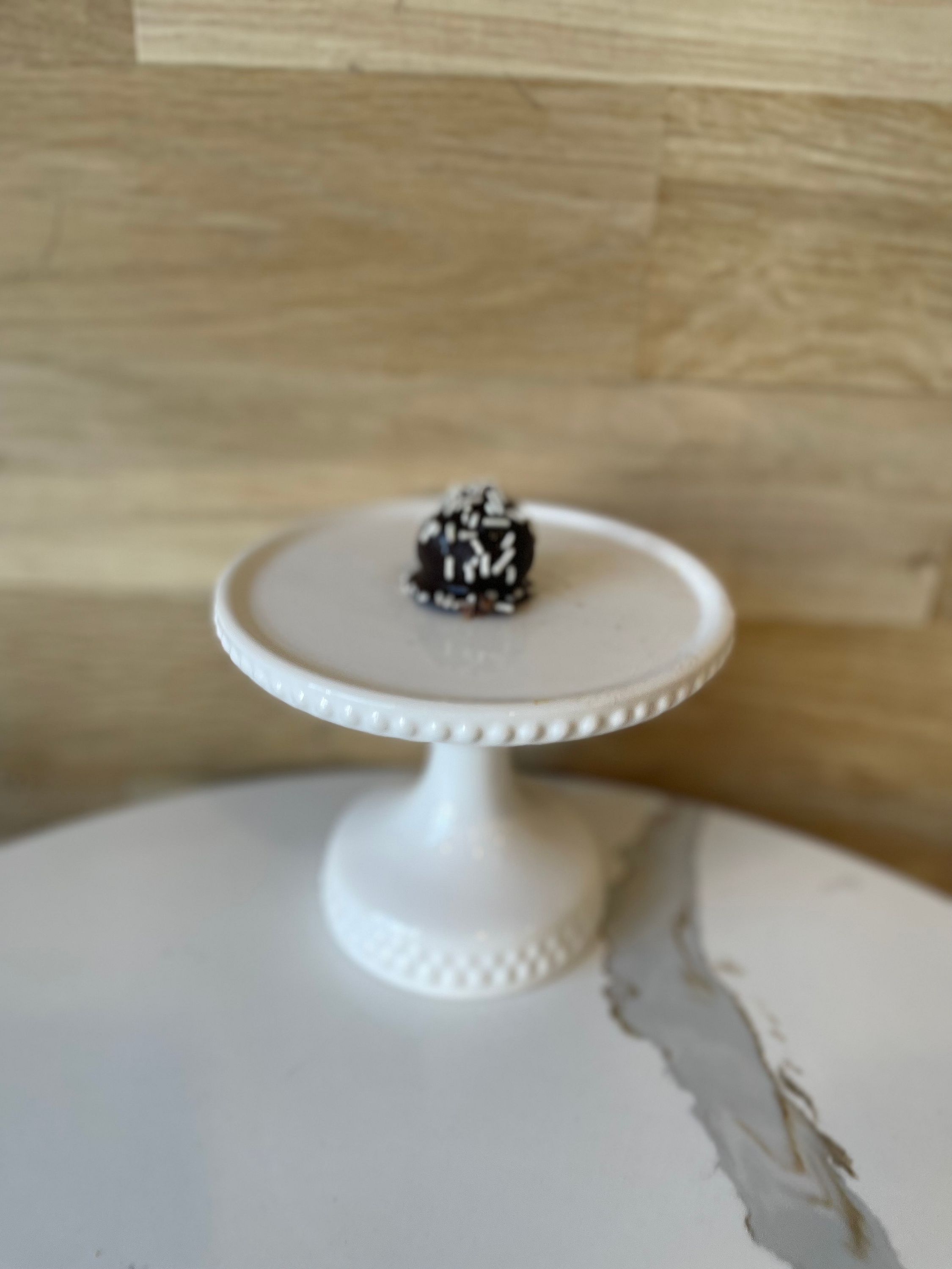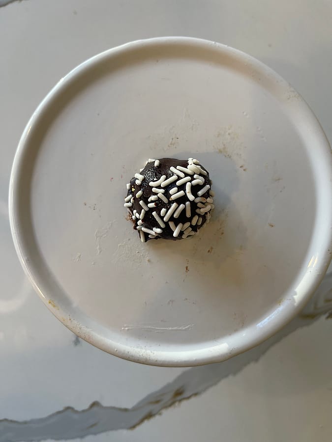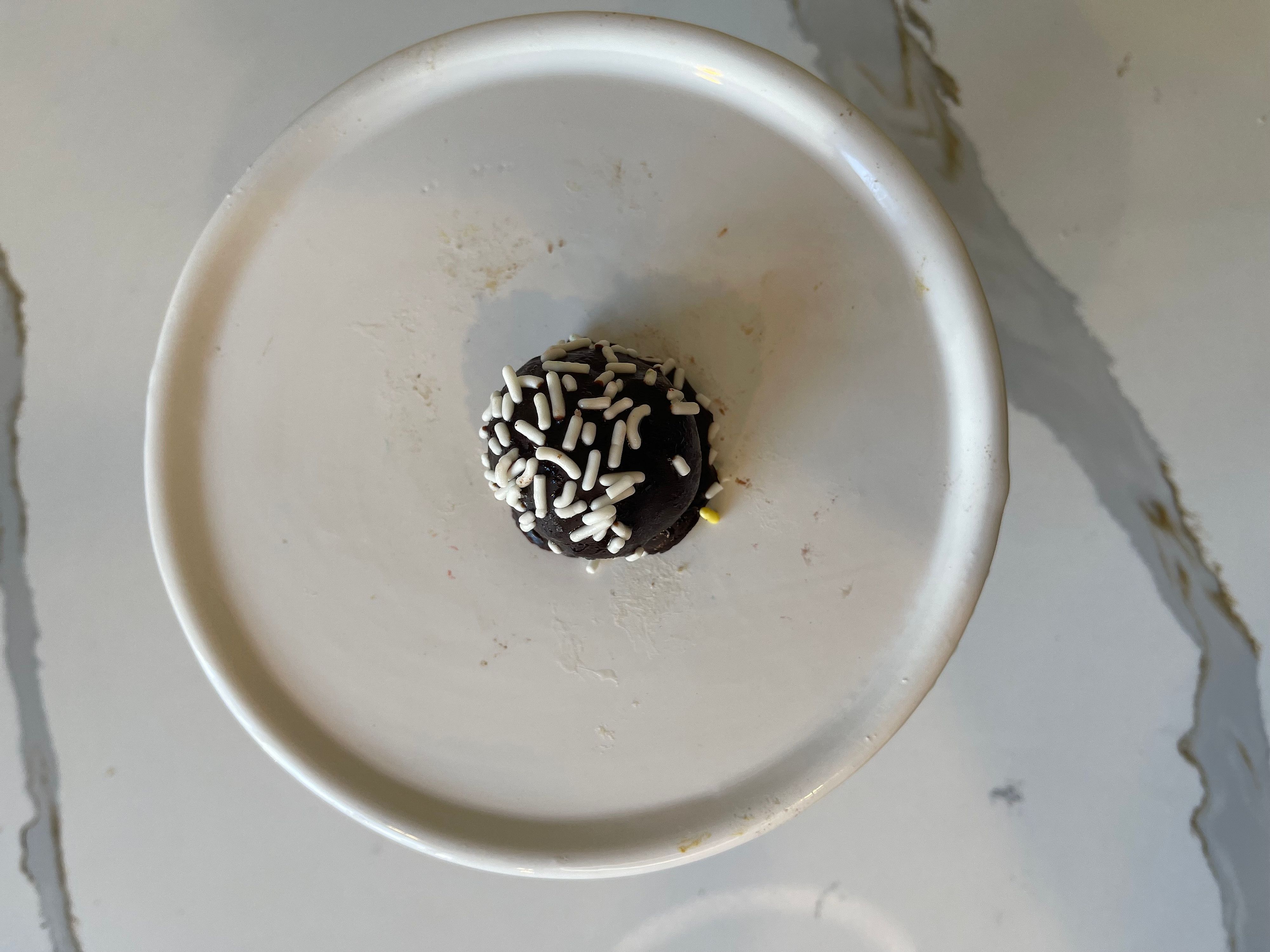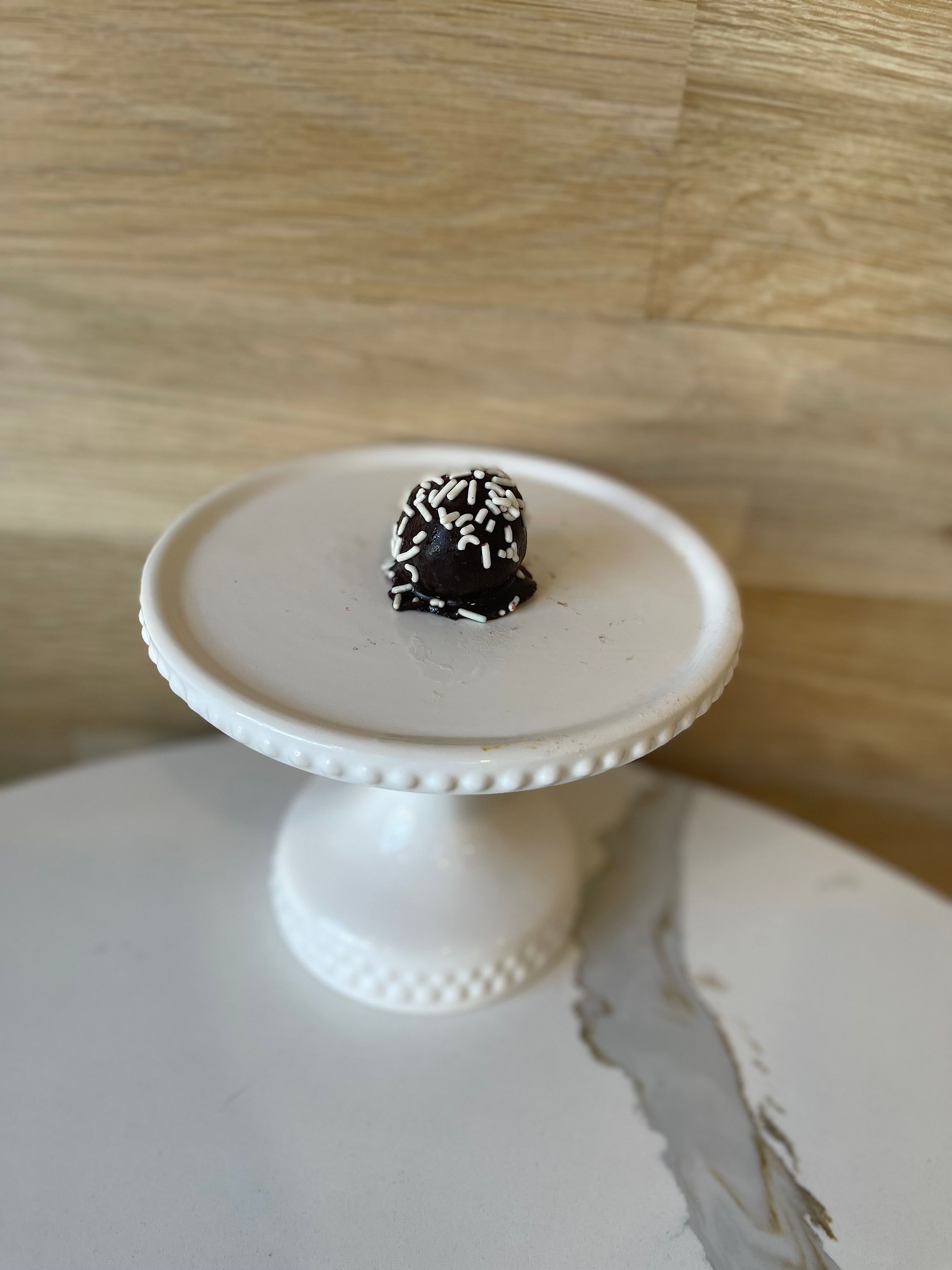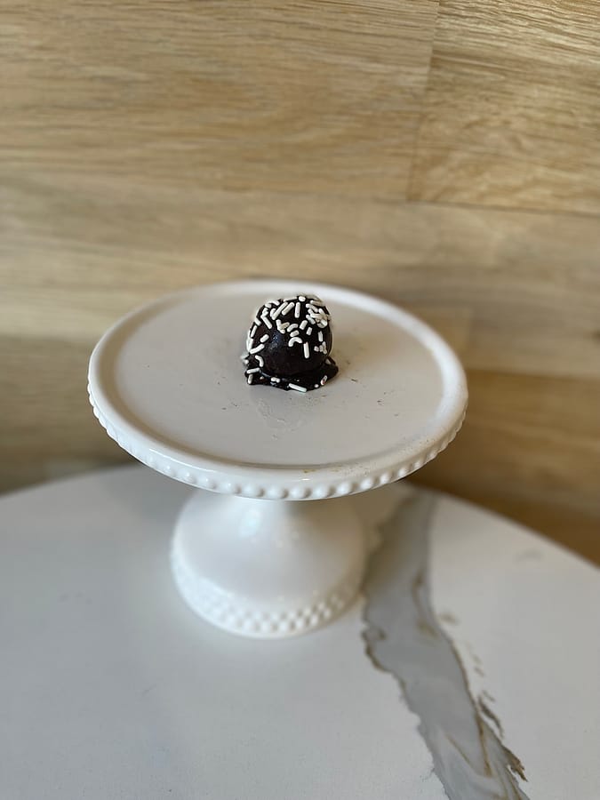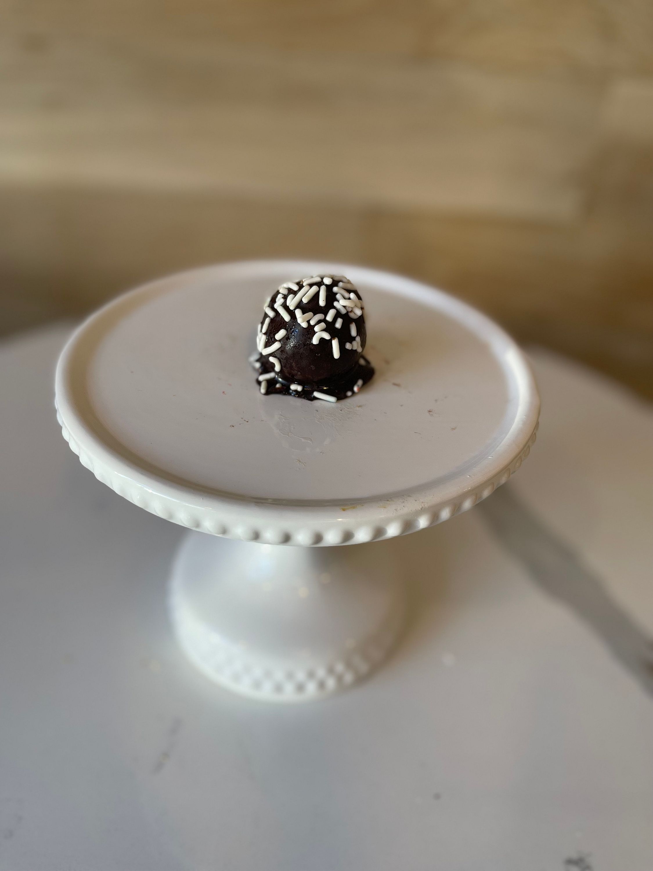 Vanilla cake dipped in chocolate and topped with white sprinkles. Dairy Free