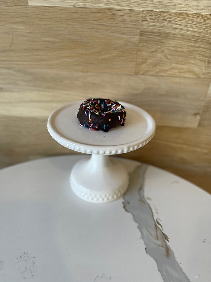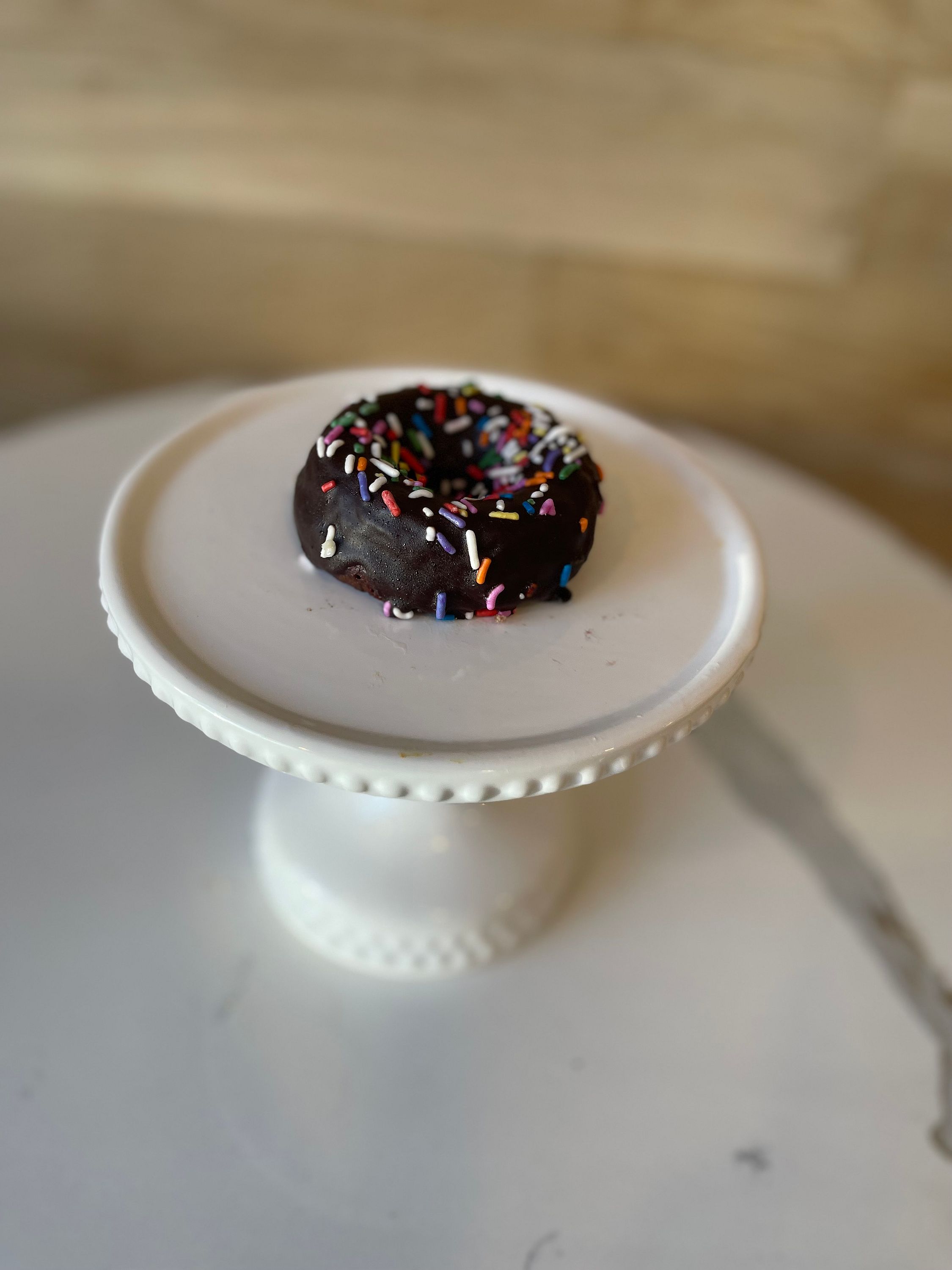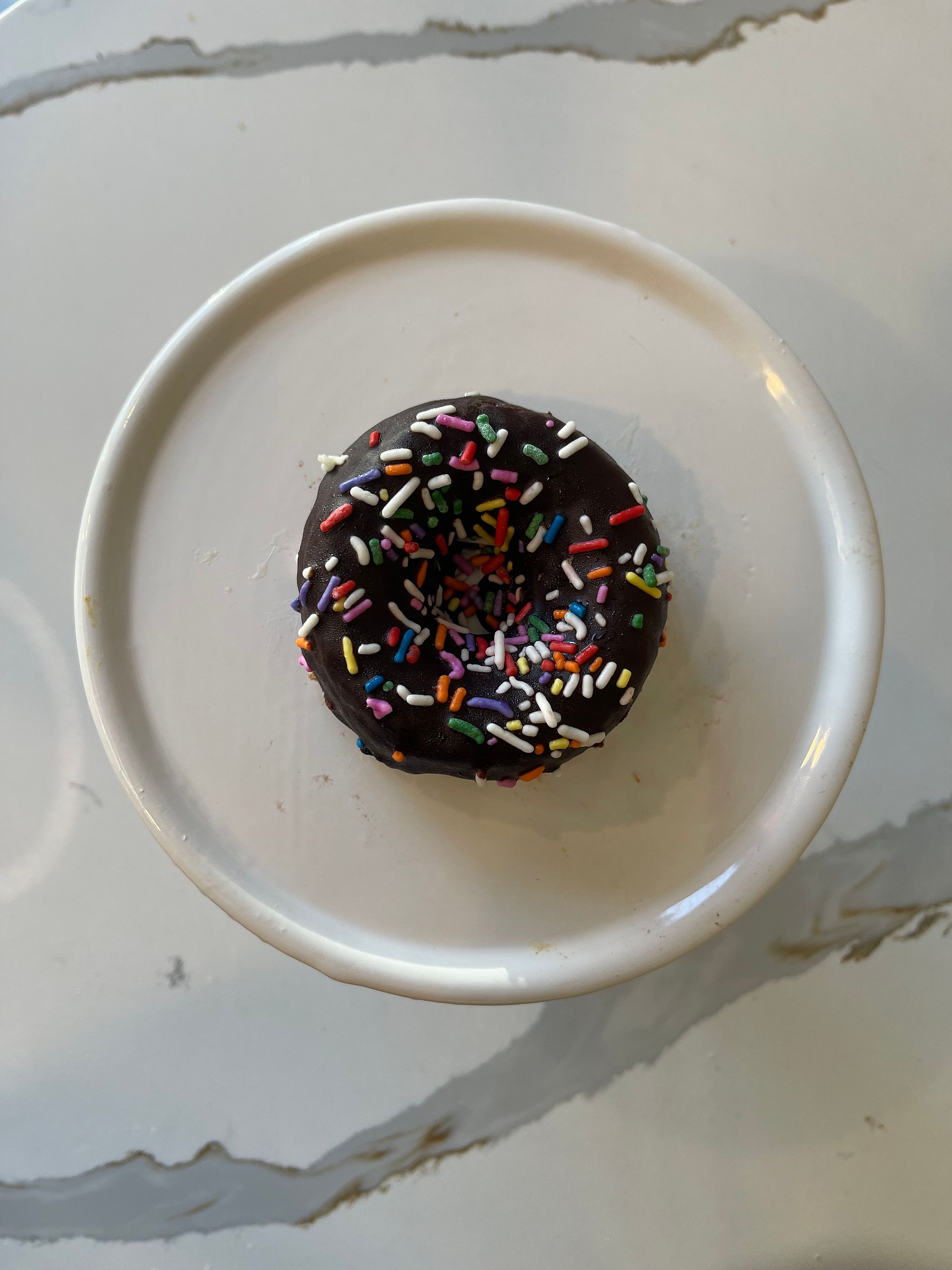 Chocolate donut dipped in chocolate and topped with rainbow sprinkles. Dairy Free Gluten Free