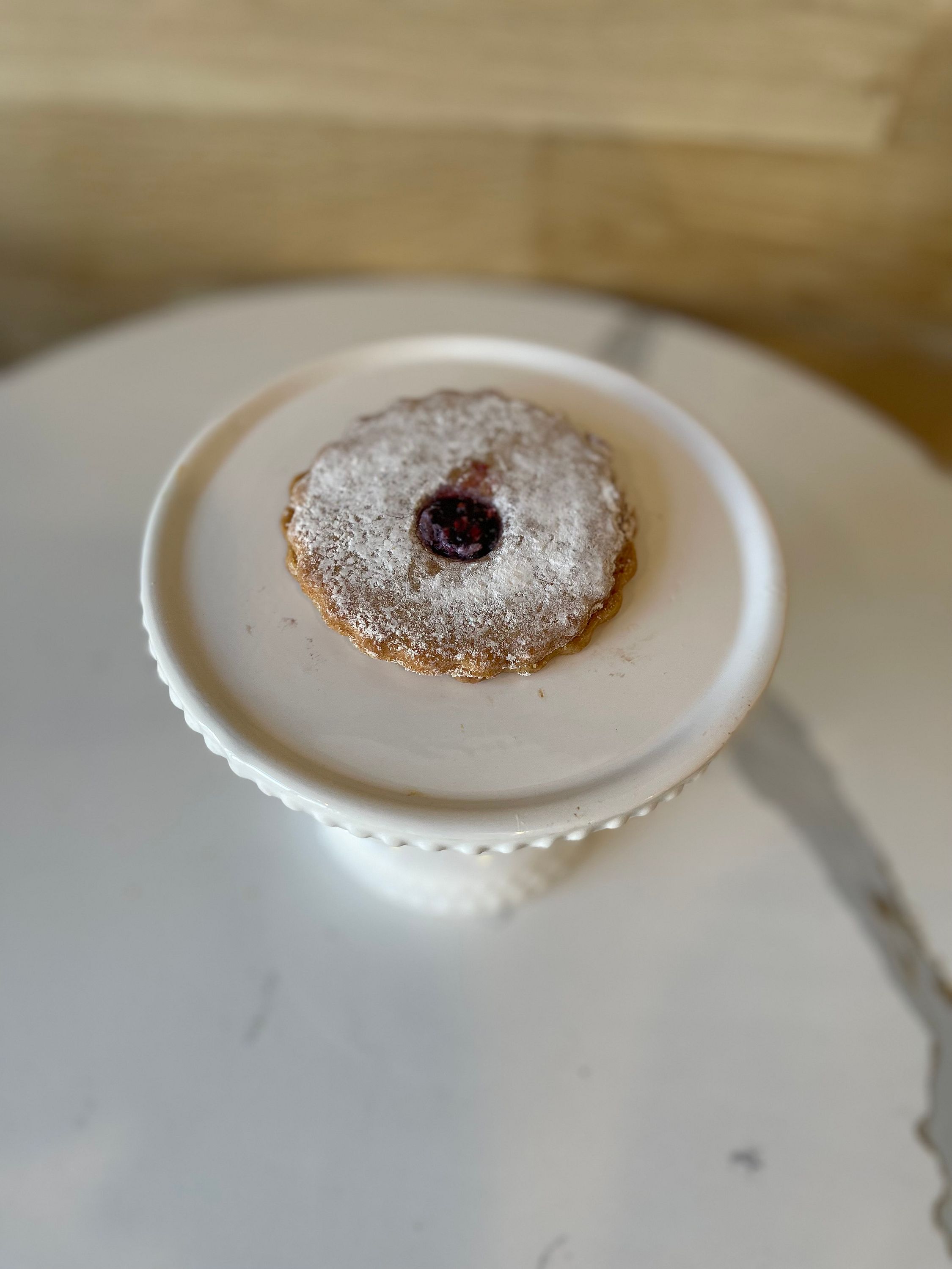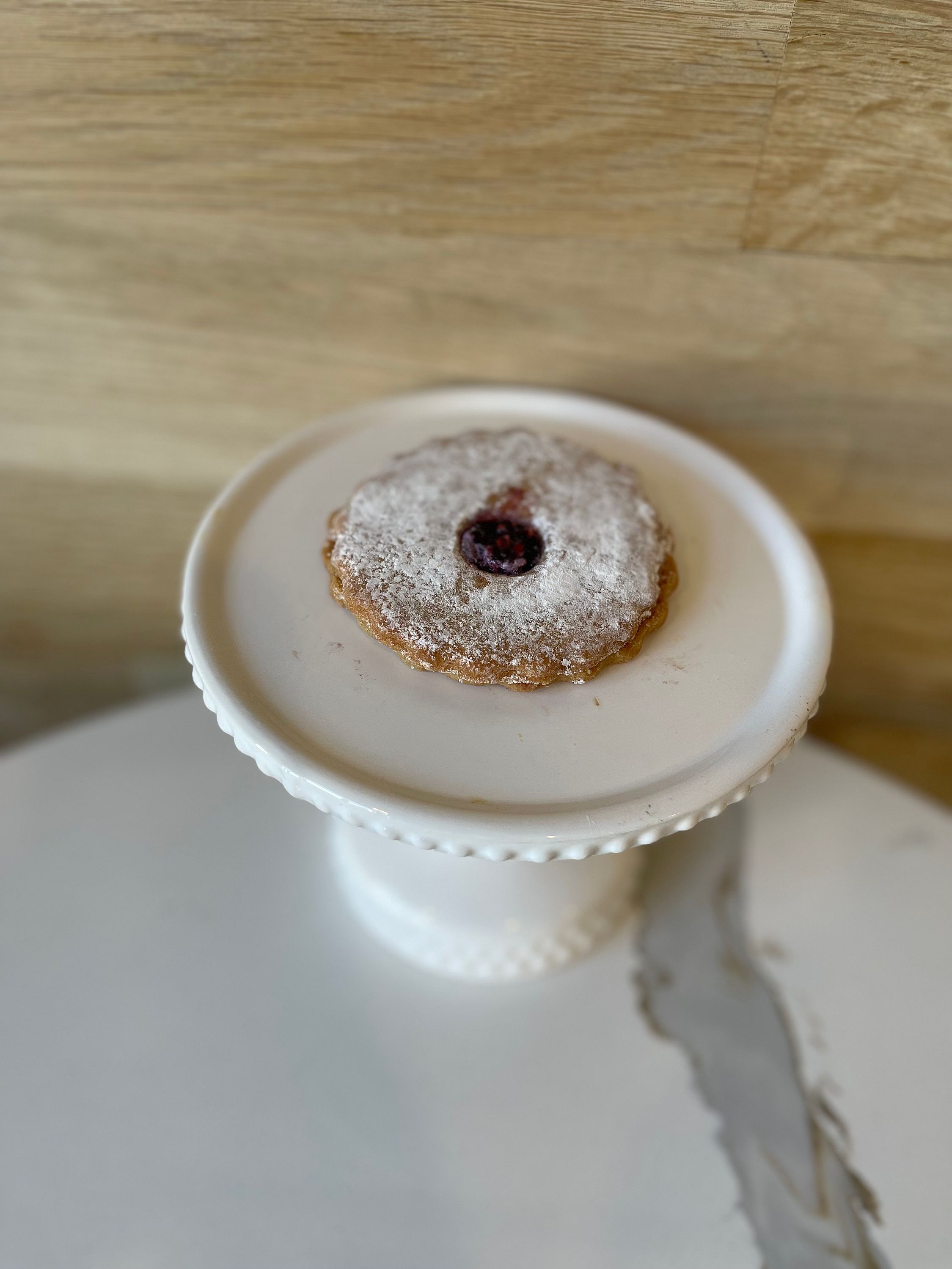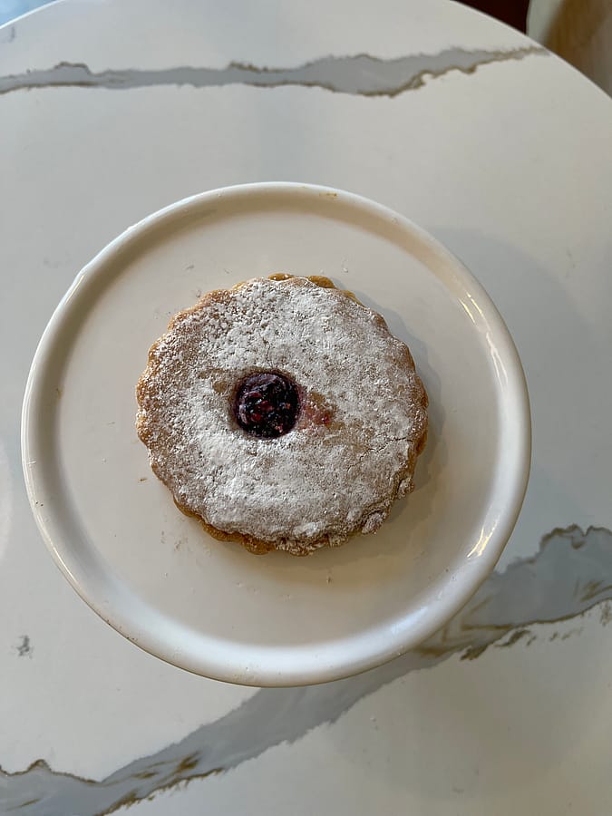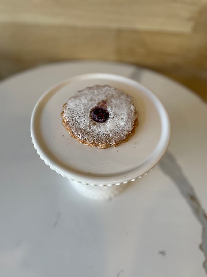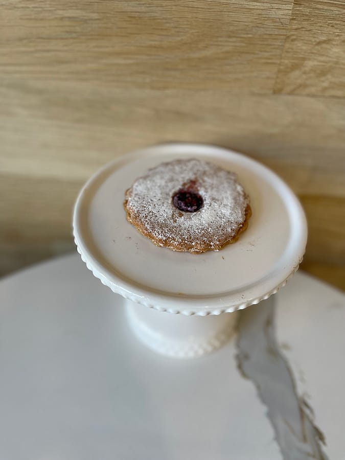 Buttery shortbread cookie filled with a layer of raspberry jam, dusted with powdered sugar. Vegan