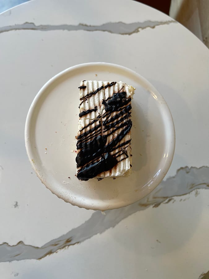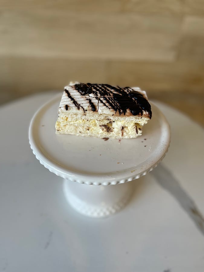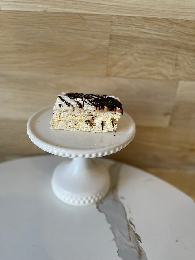 Layers of puff pastry and custard topped with dairy-free whipped cream and a chocolate drizzle. Dairy Free