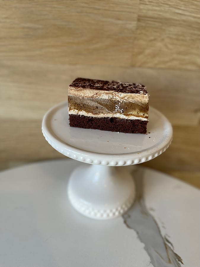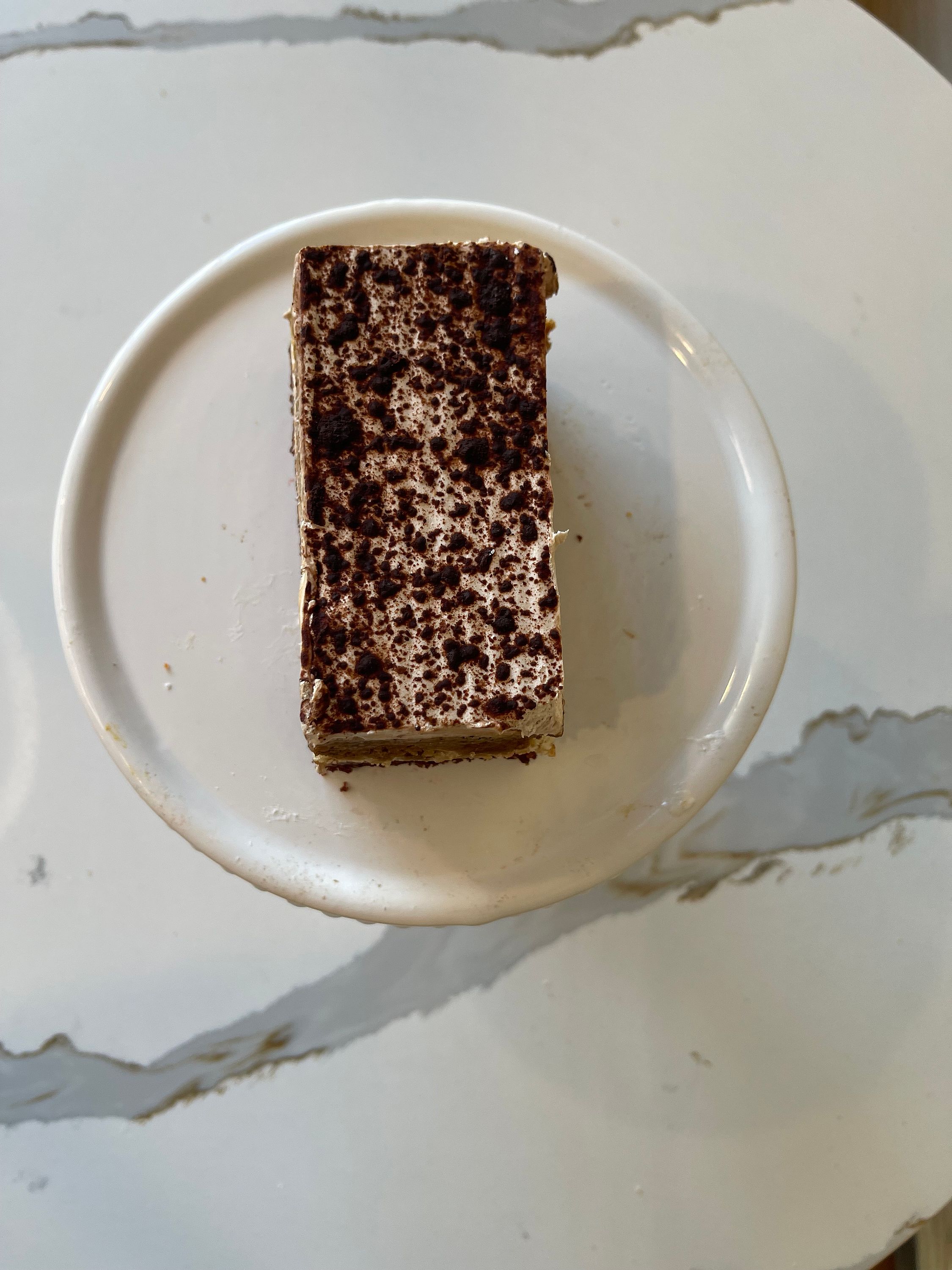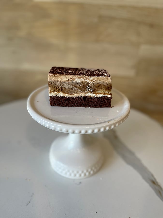 Lady fingers soaked in coffee layered with mascarpone filling topped with cocoa powder. Dairy Free