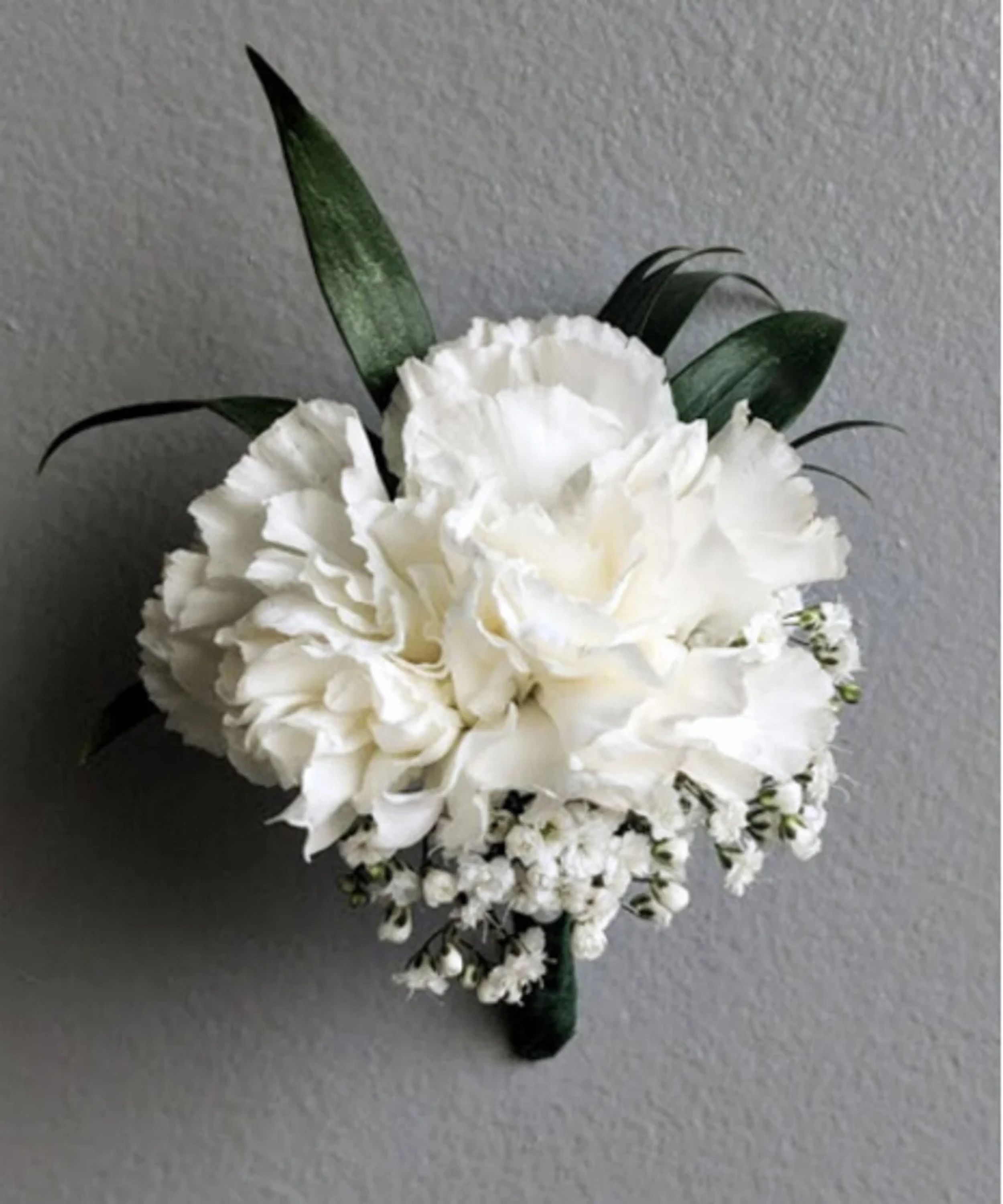 A classic white carnation and baby's breath boutonniere compliments any outfit. Perfect for prom, formal, and weddings.