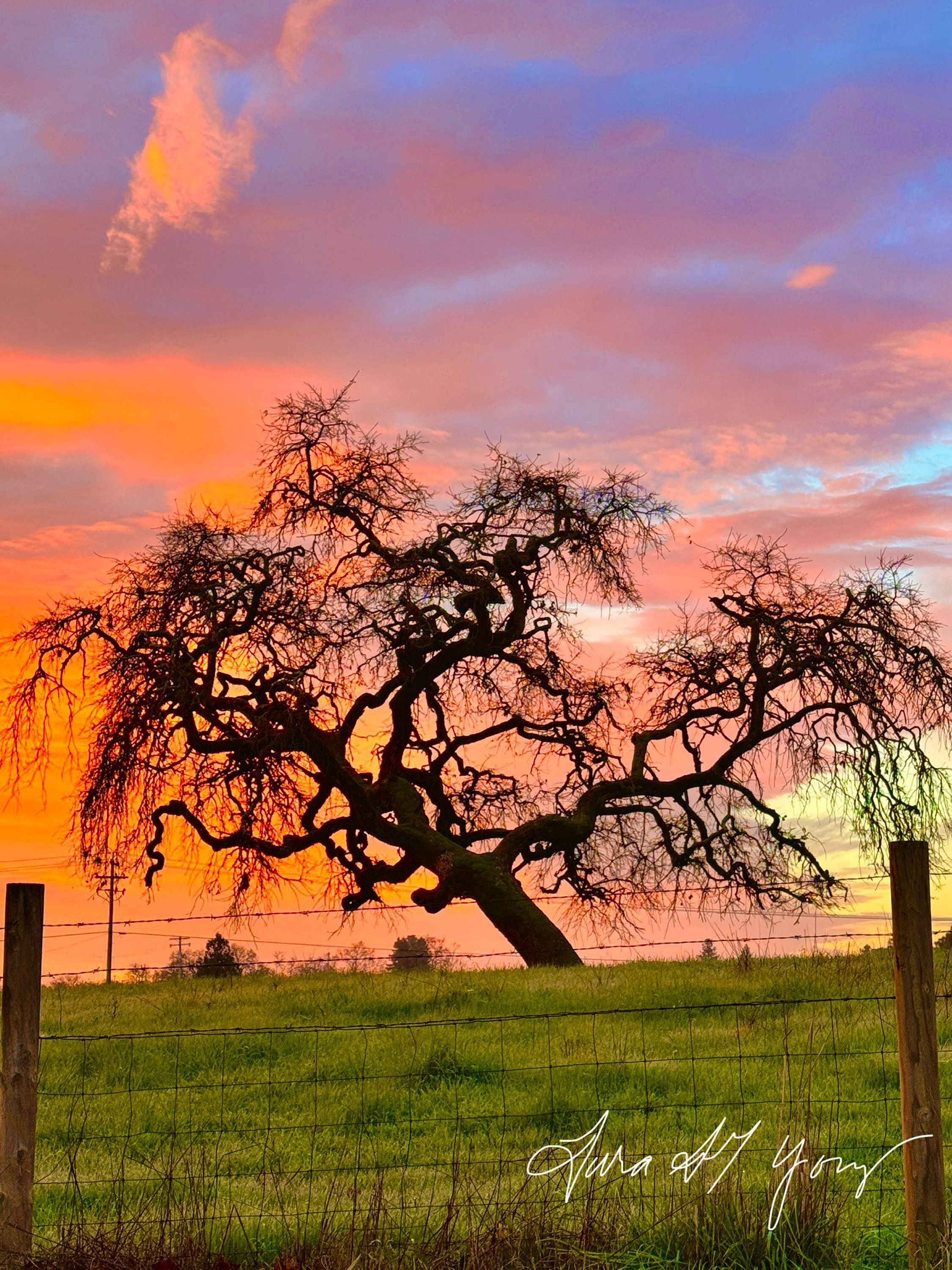 Between you, me, and the fence posts. Windsor, CA., Heritage Oak backlit by the sunrise.