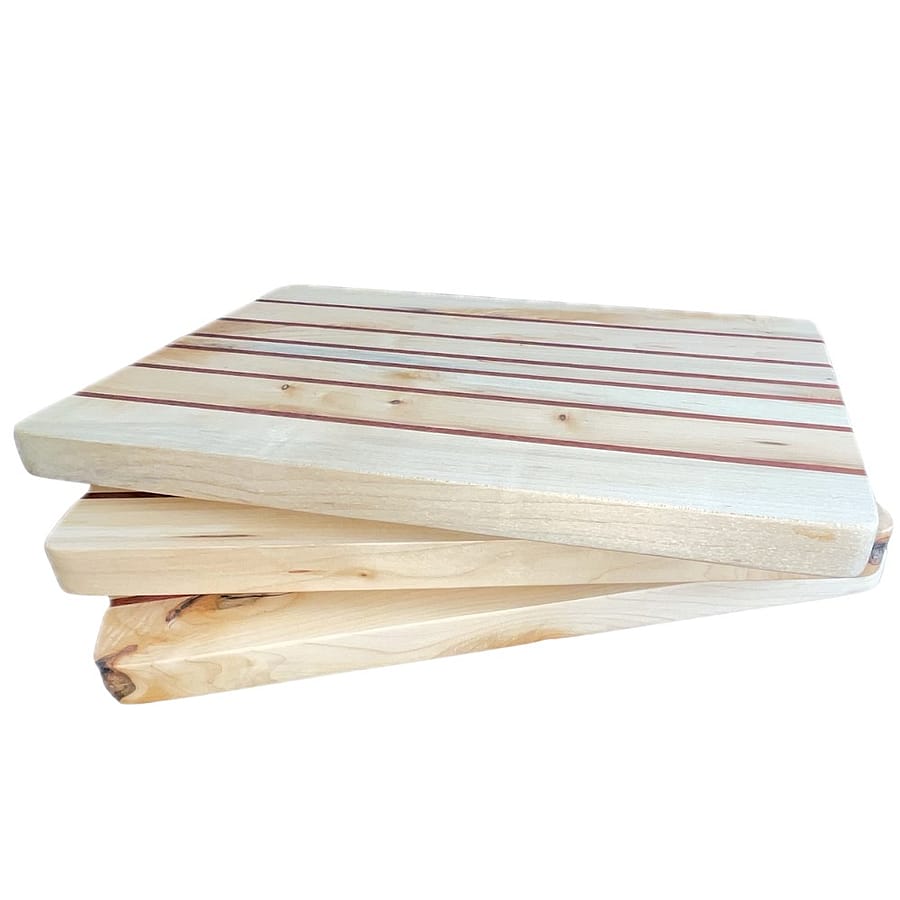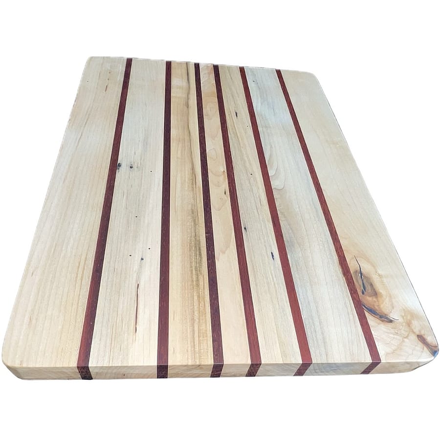This Cutting board is made with Hard Maple as well as thin strips of Padauk. Each cutting board has Rubber mountain feet rubber mounted feet that allow it to stand off any surface. Each and every cutting board is treated with a in house produced cutting board conditioner that consists of beeswax carnauba wax and mineral oil. It is always recommended that every natural wood cutting board is treated with a food grade wood conditioner either once every few months or as needed depending on usage.