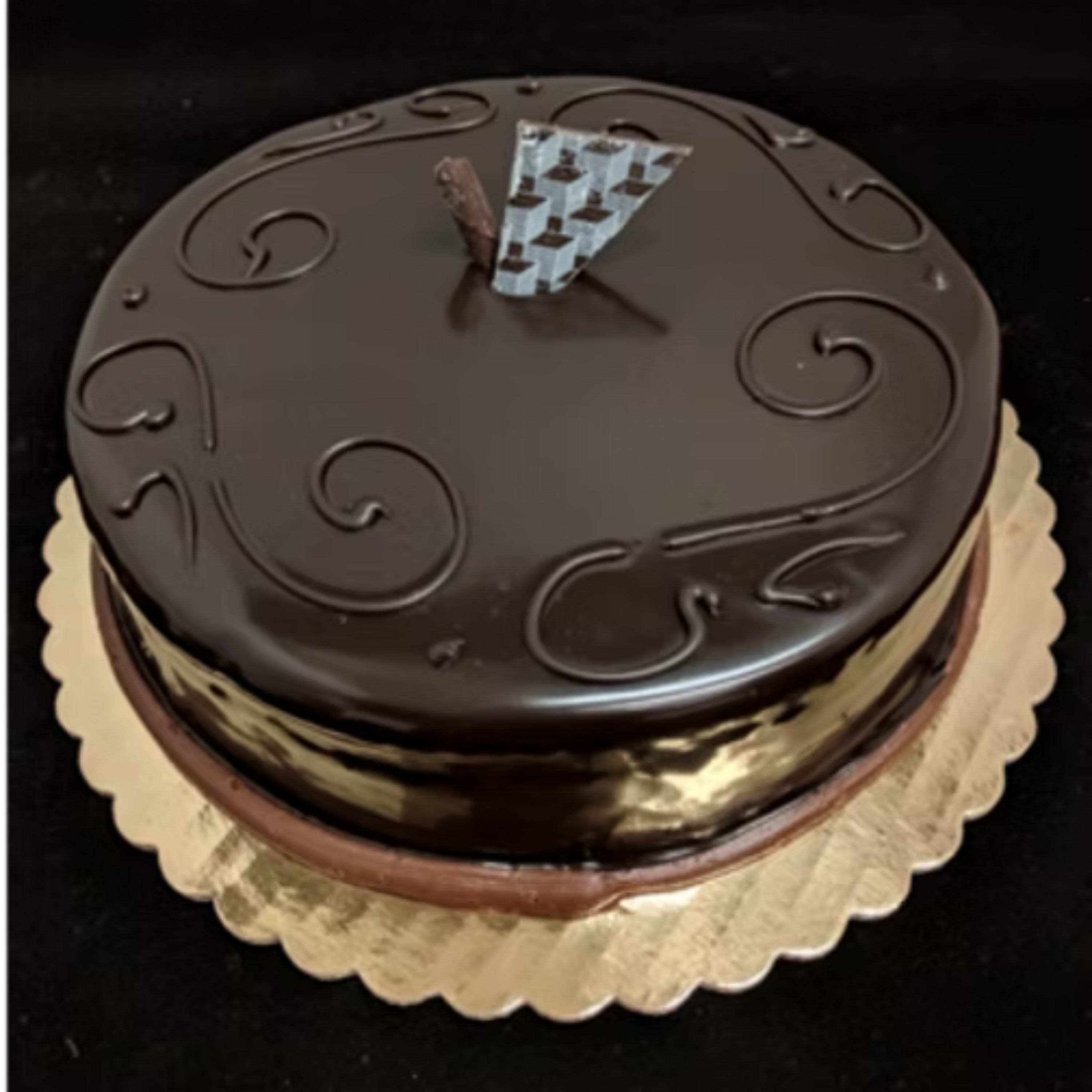 Layers of chocolate cake with chocolate mousse finished with chocolate ganache.