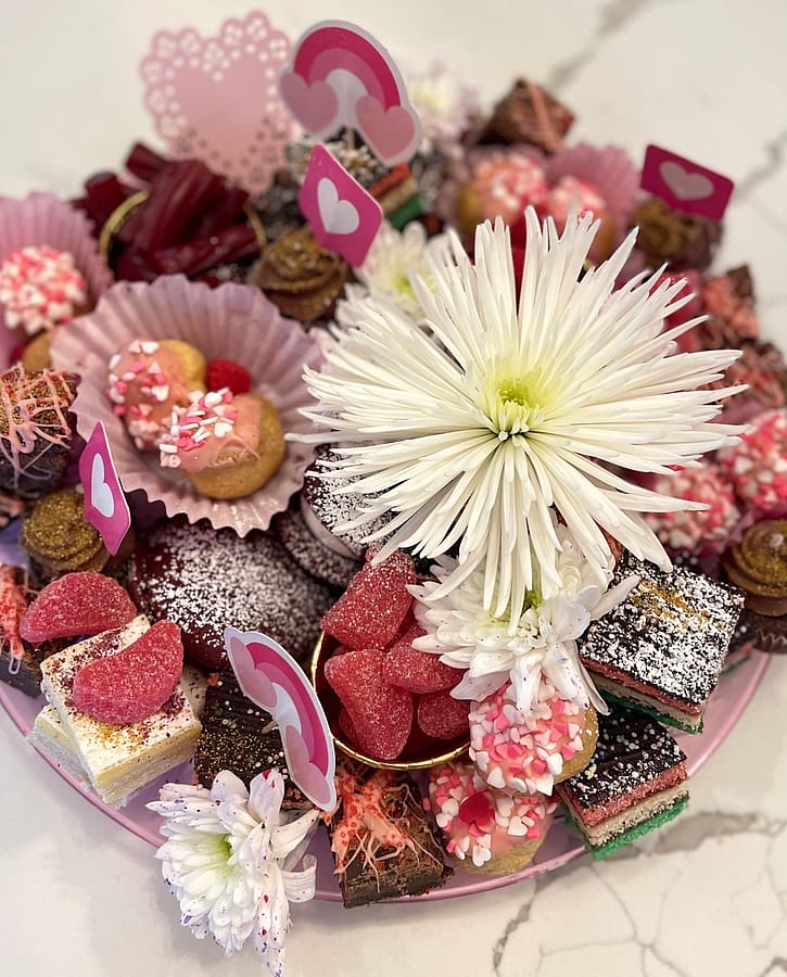 Mini Chocolate Dipped cream puffs, Decadent brownie bites, Rainbow cookies, Red Velvet Whoopie Pies, Linzer tarts on an antique vintage dish platter #vday26