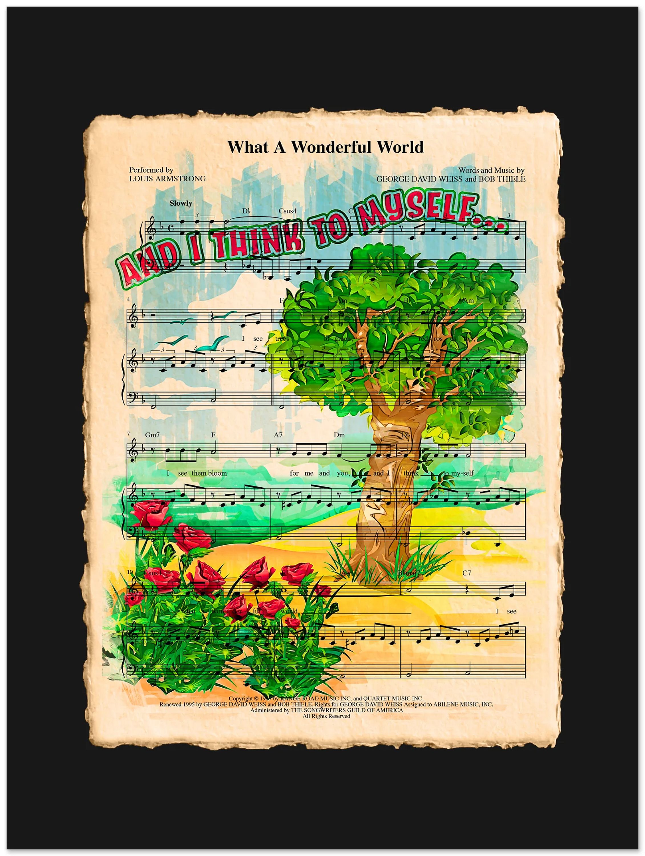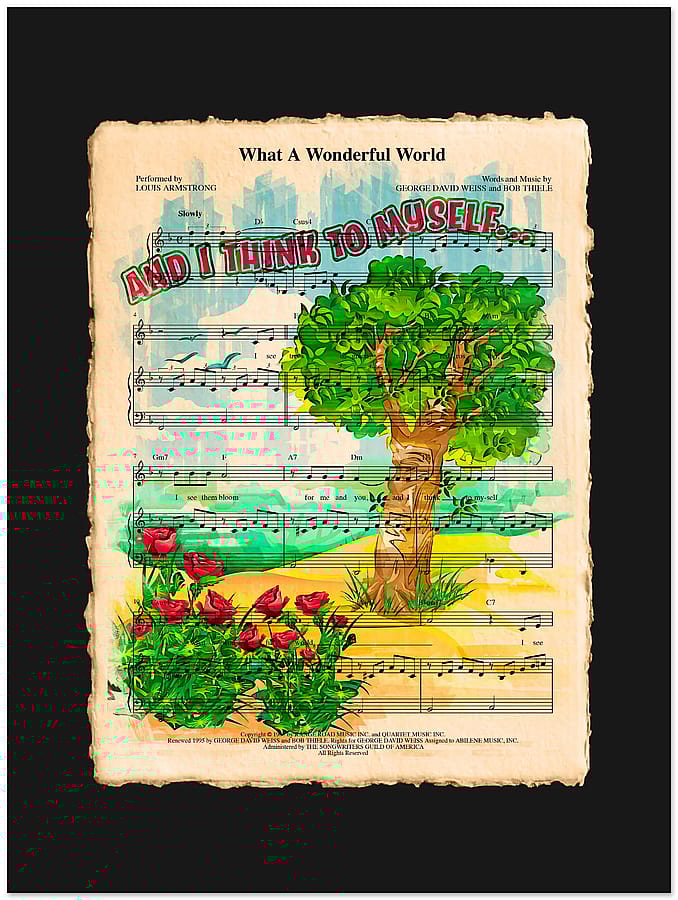 Original creative design layered over authentic sheet music, capturing the essence of music and art. Perfect for music lovers and avid fans of Louis Armstrong.