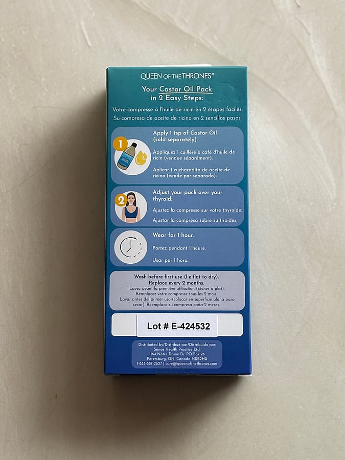 HOW DO I DO IT? Apply 1 tsp of Queen of the Thrones Organic Castor Oil (sold separately) onto the soft cotton side of the Castor Oil Pack or directly onto your thyroid area. Put on your Queen of the Thrones Castor Oil Pack fro Thyroid and secure it in place. Wear for 1 hour daily.