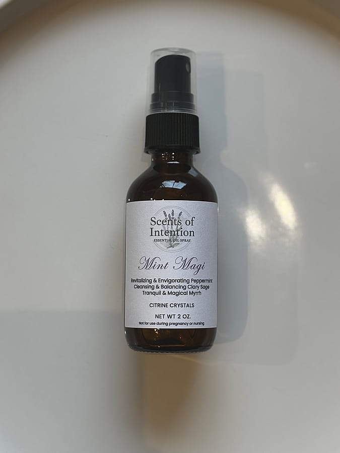 Scents of Intention's Mint Magi is a small-batch, artisan-crafted holiday essential oil spray featuring a blend of peppermint, clary sage, and myrrh. Designed to be revitalizing, invigorating, and cleansing.