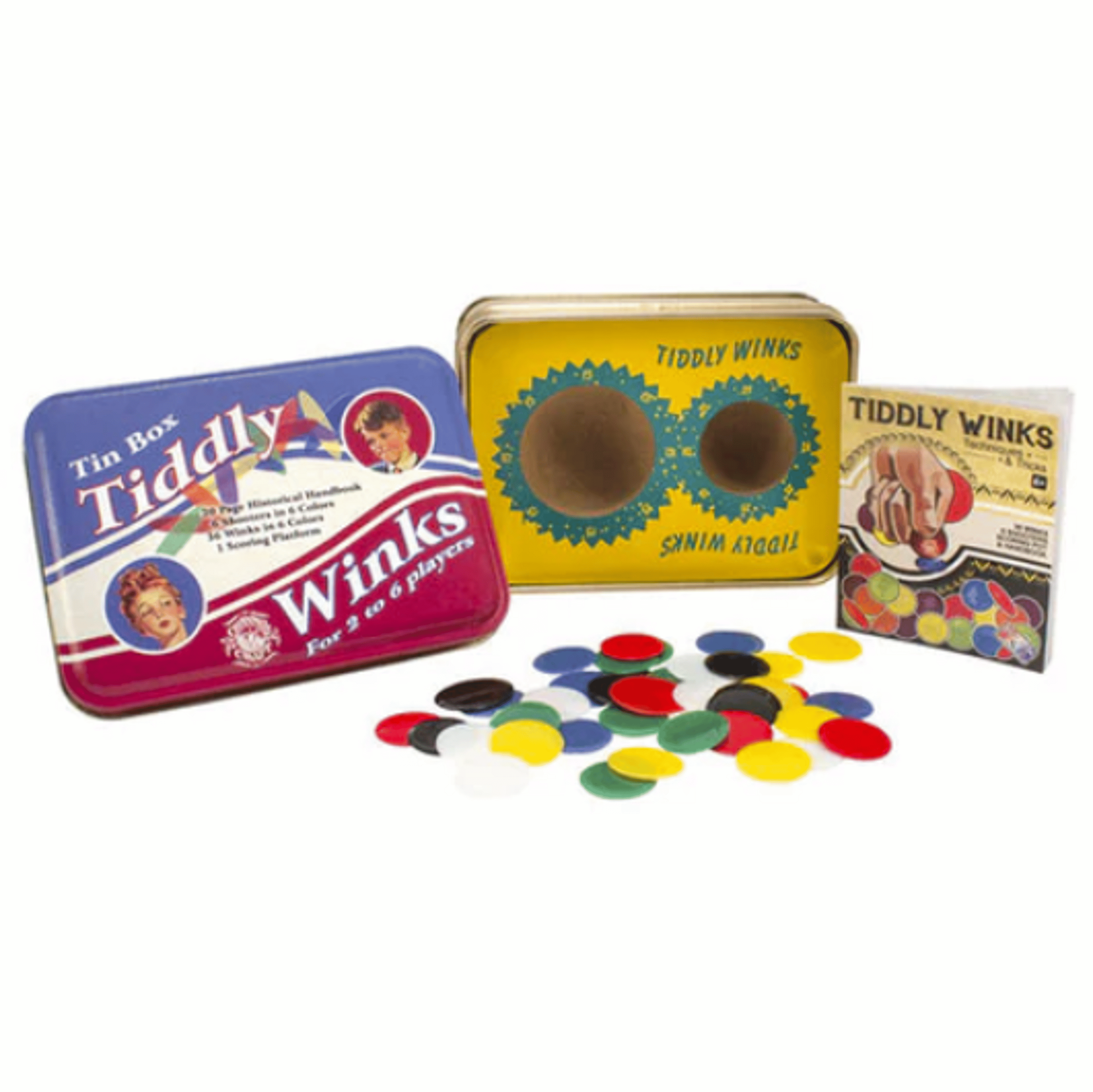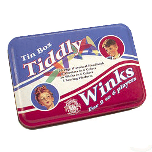 Classic tiddlywinks game in a collectible tin box — easy to store and take on the go