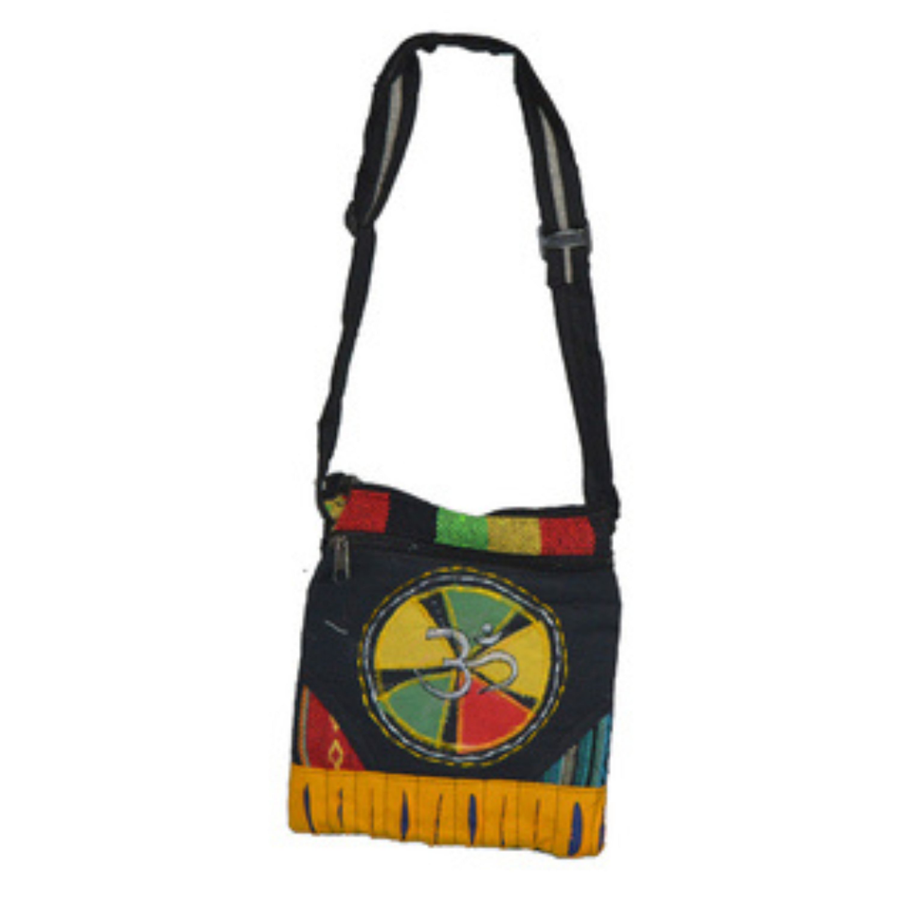 A compact tote bag with adjustable straps made from colorful woven fabric featuring an Om design.