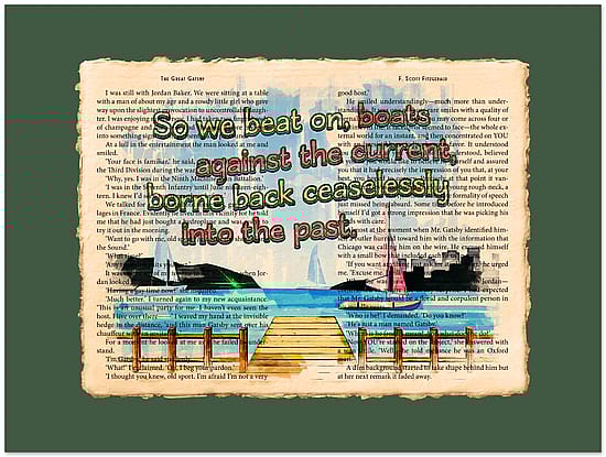 Original creative design layered over authentic book pages, capturing the essence of literature and art. Perfect for book lovers and avid fans of The Great Gatsby by F. Scott Fitzgerald.