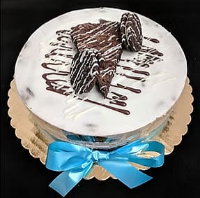 Chocolate brownie filled with oreo mousse, frosted with hard white icing. 8-Inch
