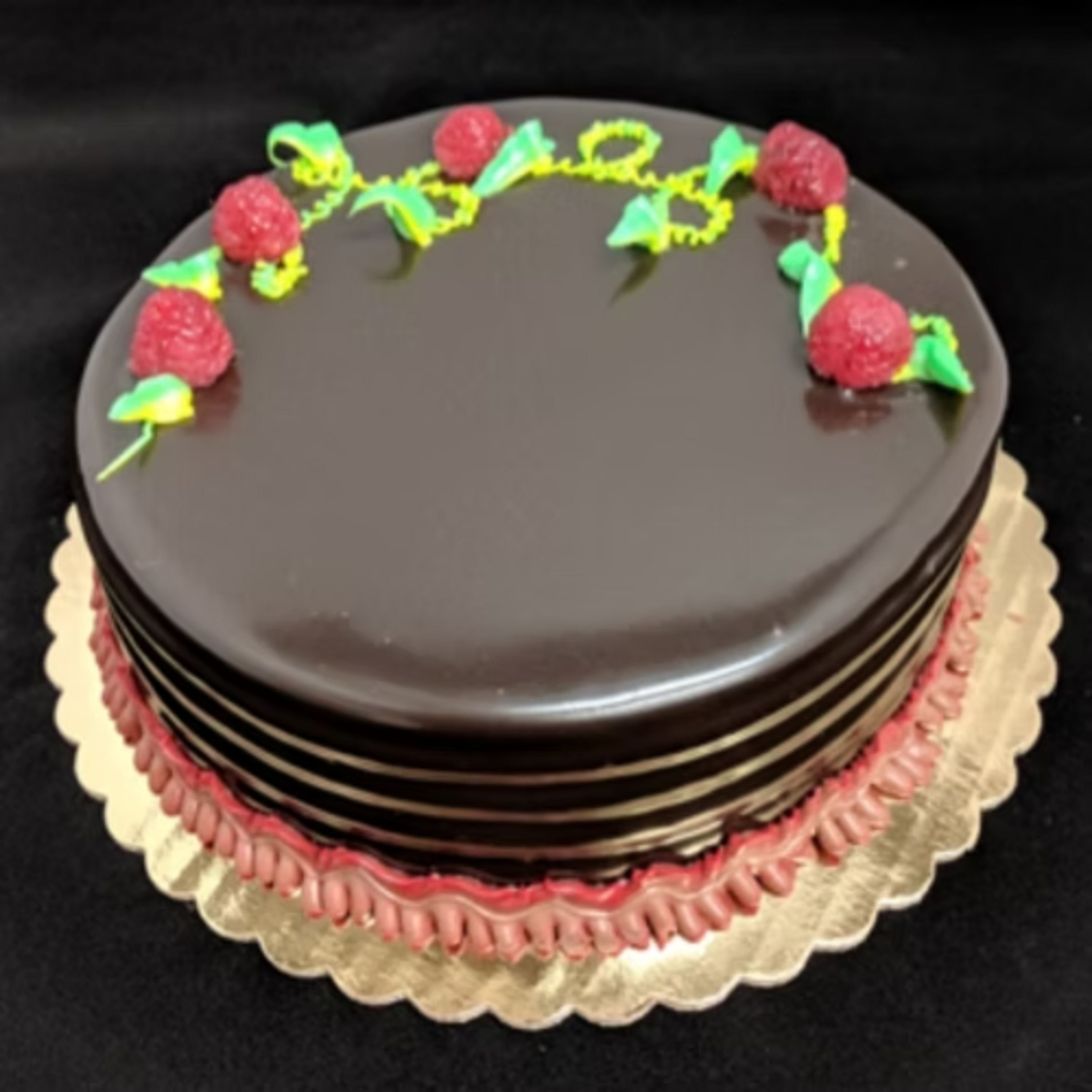 Velvety rich chocolate cake filled with raspberry mousse and finished with chocolate ganache.