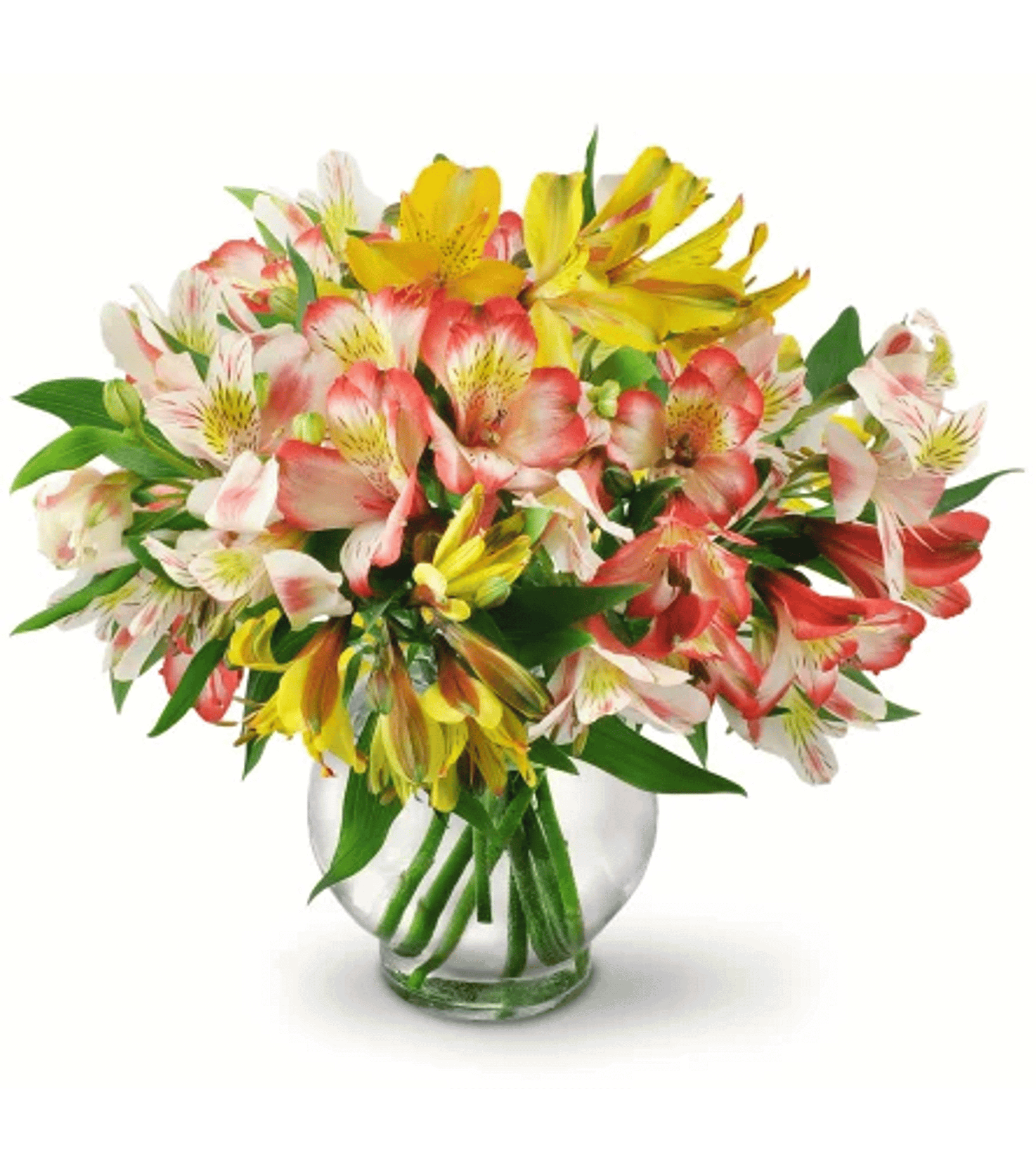 Bountiful stems of yellow, white, and red alstroemeria mingle in a classic vase.