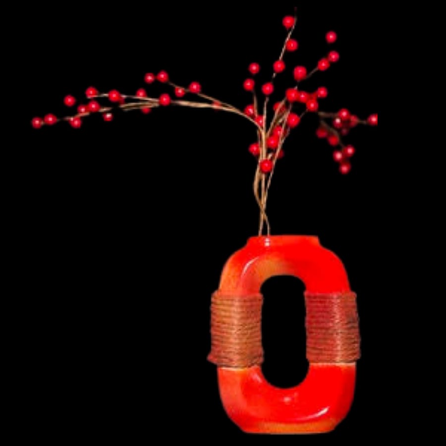 Bold, warm, and completely unique, the “Deep Red Sunset” vase is a one-of-a-kind décor piece designed to make a statement. This small oval-shaped vase features a rich red finish reminiscent of a glowing sunset, accented with natural rope detailing that adds texture and contrast.