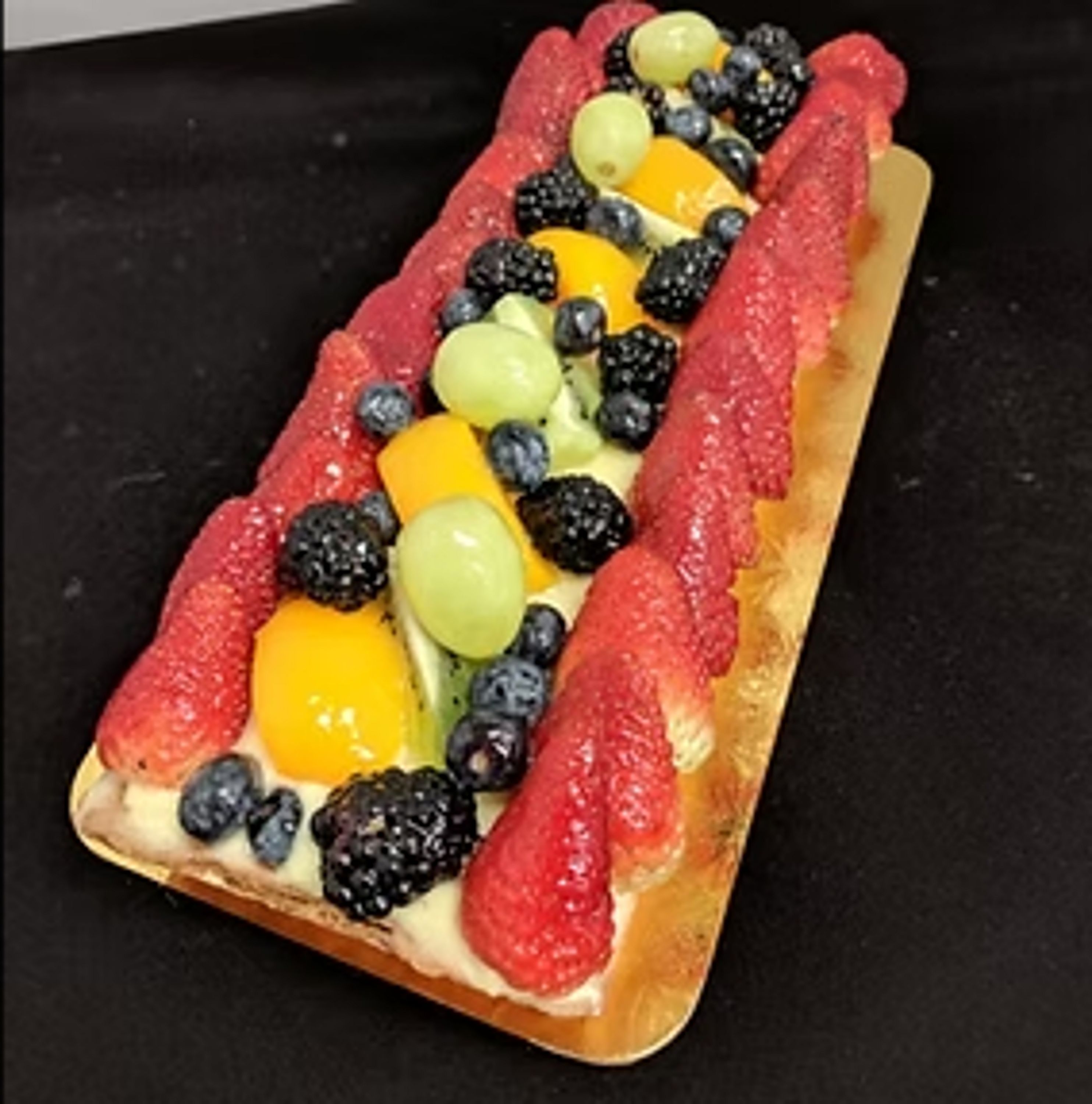 An array of exotic fruit that lies upon a light Chantilly cream & it’s nestled in crispy cookie dough. 8-Inch