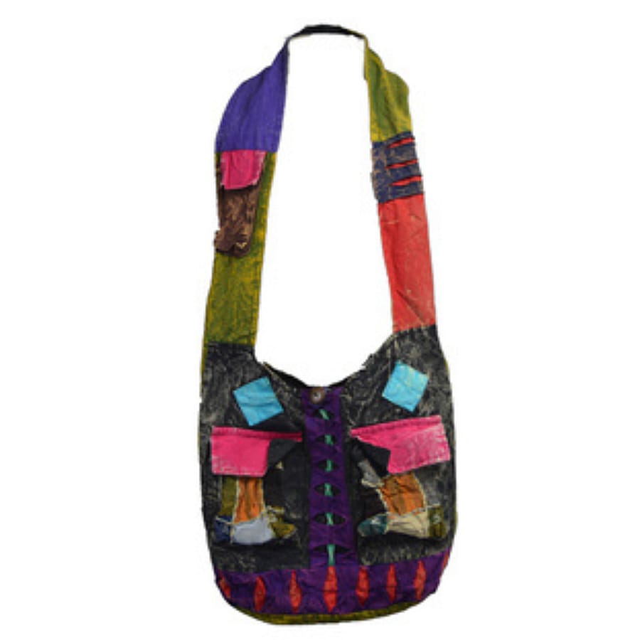 A crossbody sling bag featuring a colorful patterned design. We are a quality producer of reasonably priced, fashion-forward pieces designed for real women. The brand is known for its distinctive fabrics, unique prints, and a full range of casual and dress styles. Materials used include georgette, cotton voile, rayon crepe woven fabrics, and acrylic.