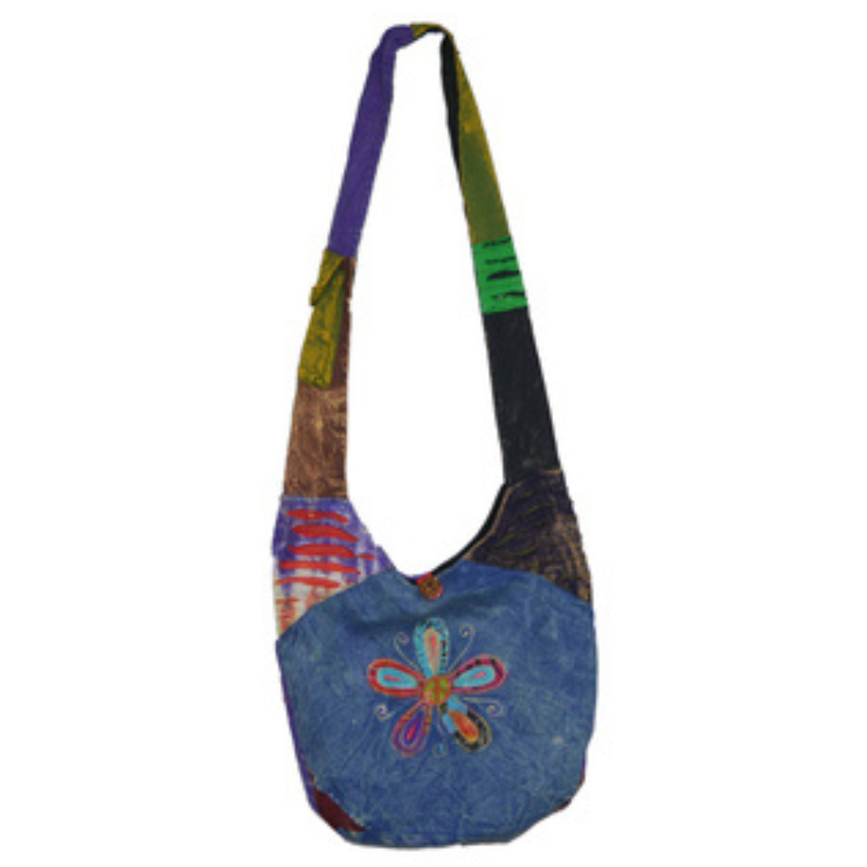 A crossbody sling bag featuring a colorful patterned design and a flower.