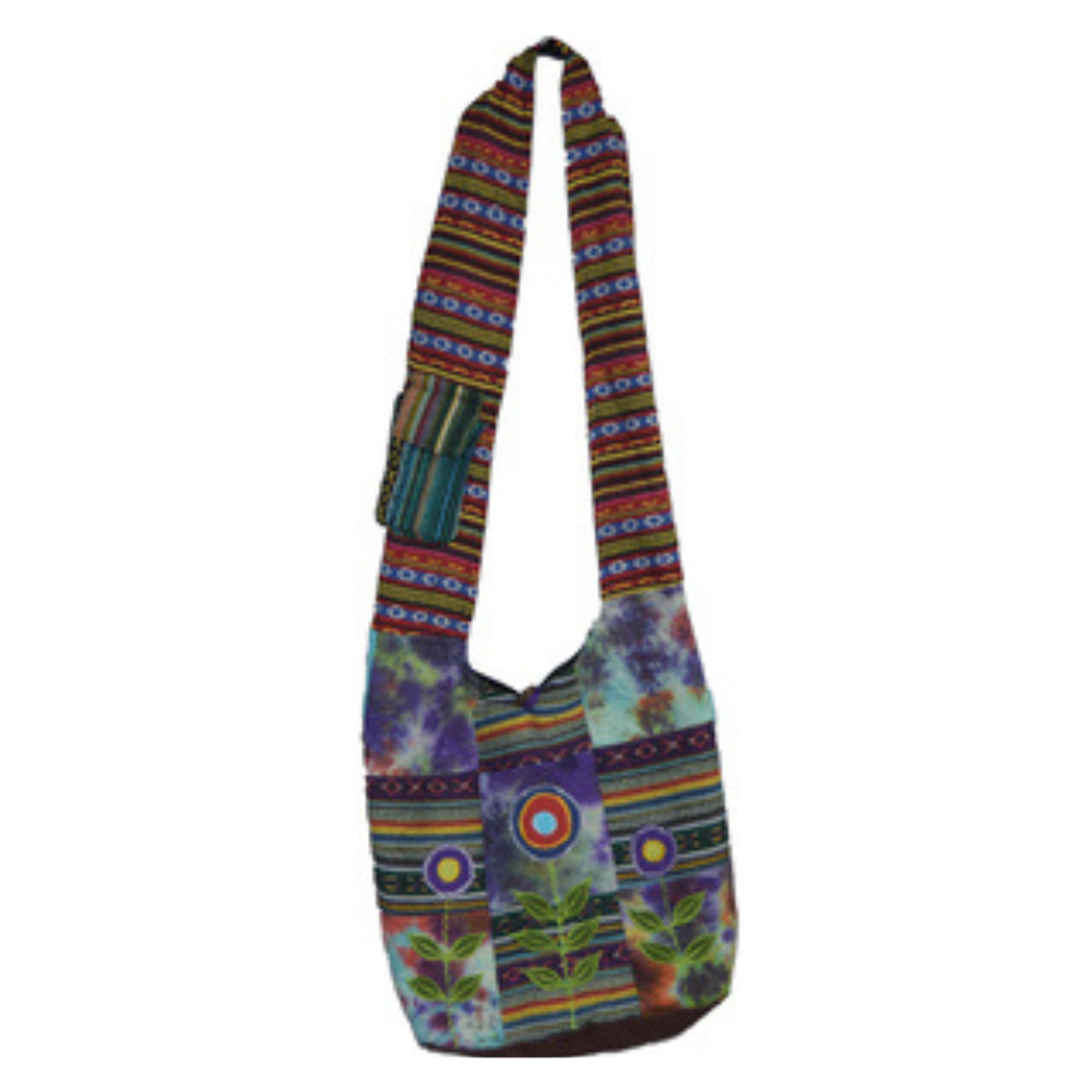 A crossbody sling bag featuring a colorful patterned design with flowers. We are a quality producer of reasonably priced, fashion-forward pieces designed for real women. The brand is known for its distinctive fabrics, unique prints, and a full range of casual and dress styles. Materials used include georgette, cotton voile, rayon crepe woven fabrics, and acrylic.