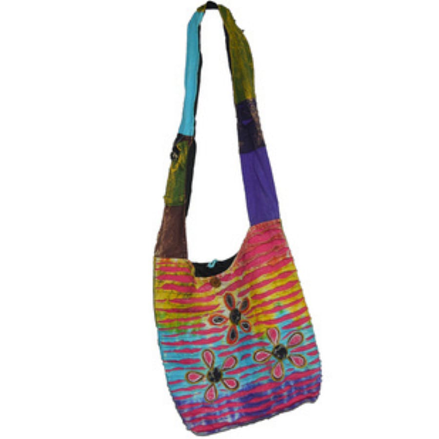 A crossbody sling bag featuring a colorful patterned design with flowers.