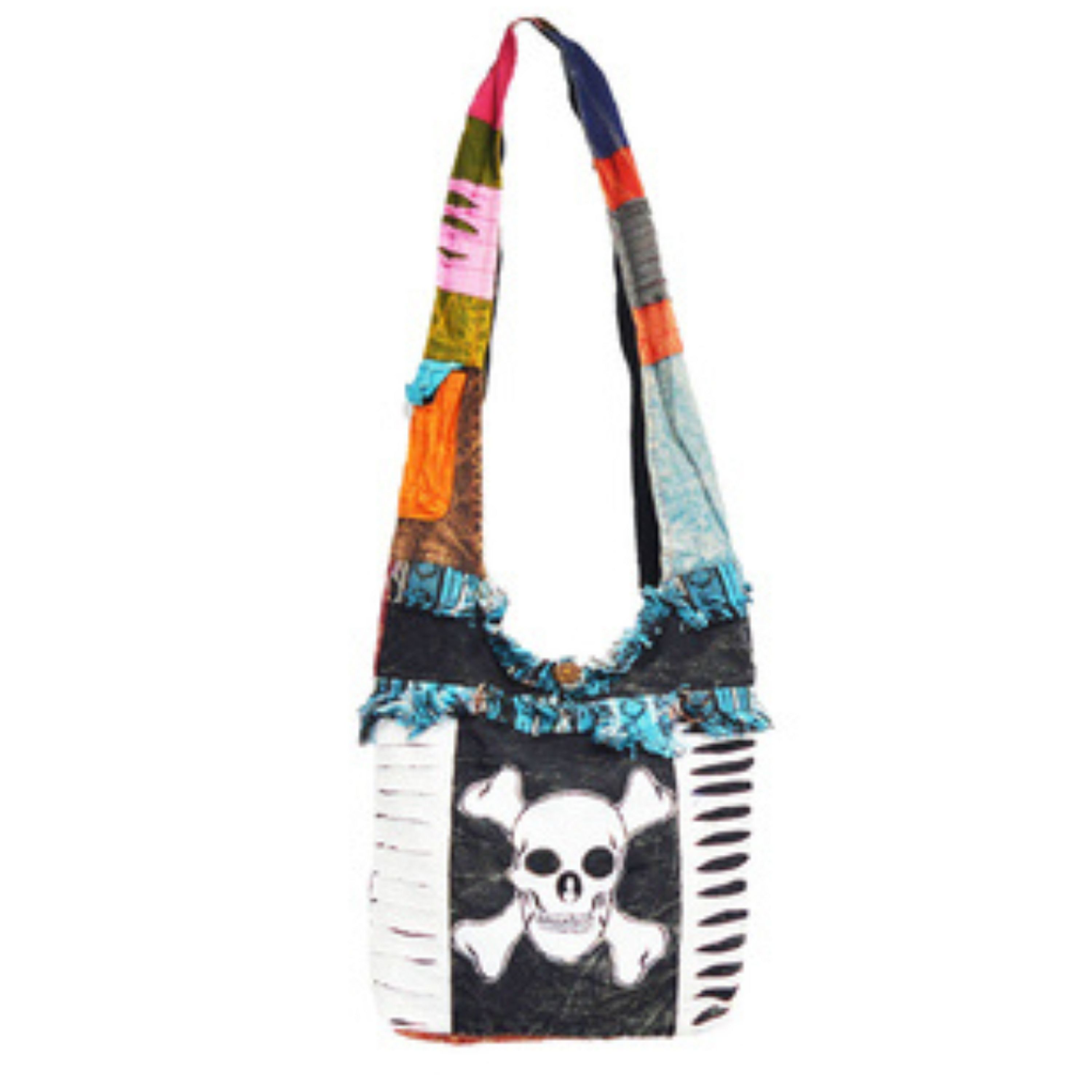 A crossbody sling bag featuring a colorful patterned design with a skeleton at the center.