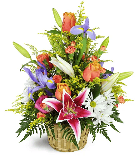 Stargazer lilies, irises, and more are expertly arranged in a bamboo basket.
