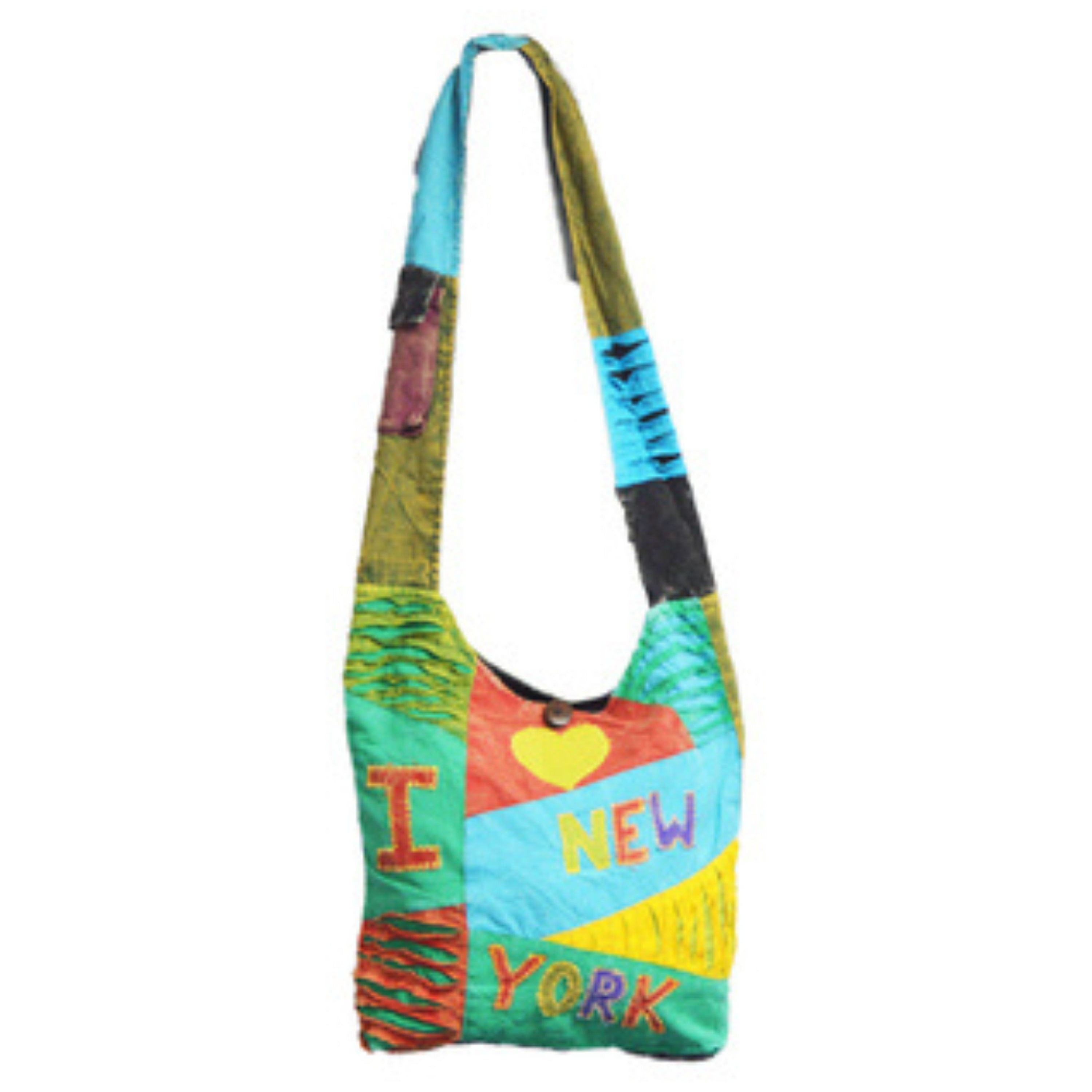 A crossbody sling bag featuring a colorful pattern.