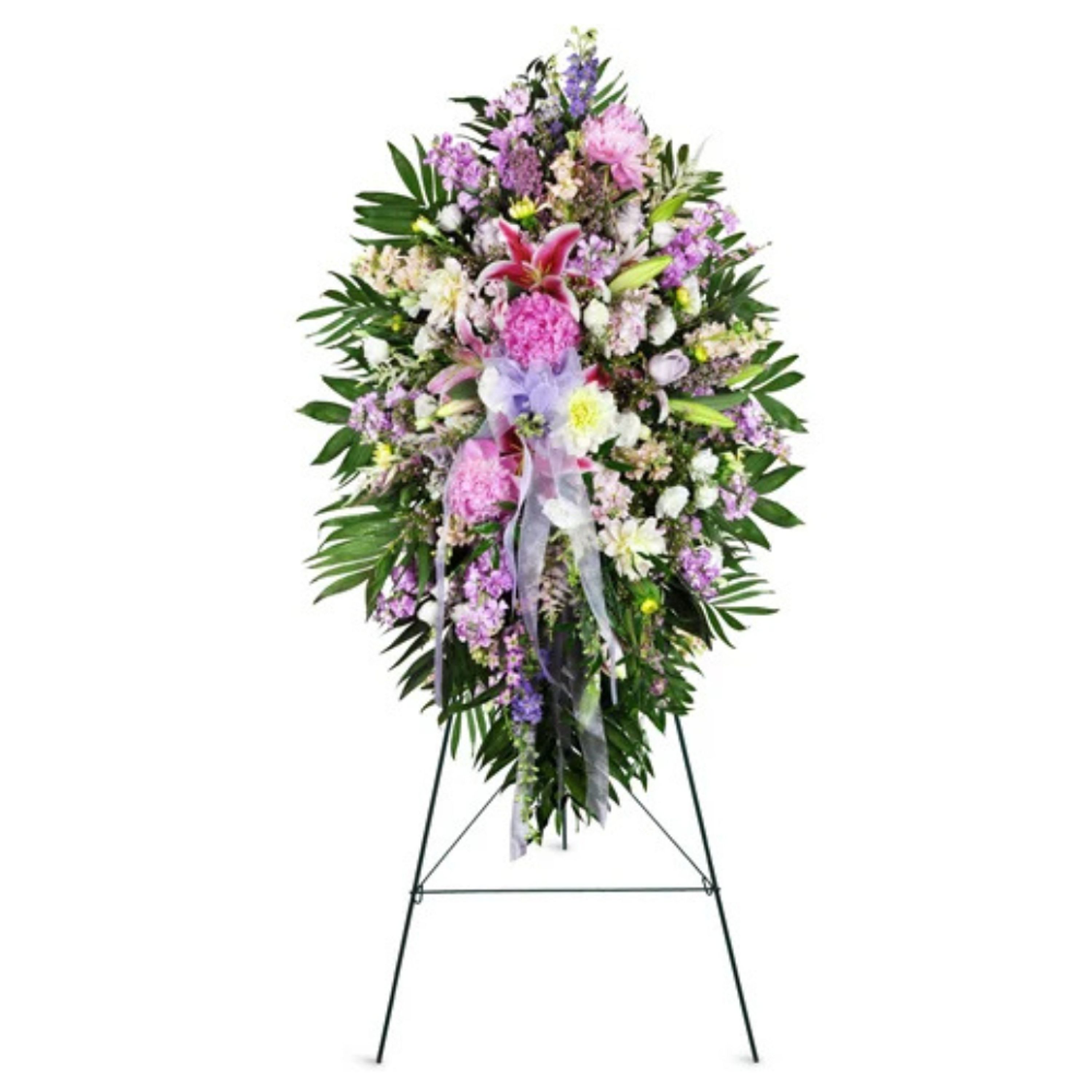 This standing spray features a comforting assortment of lilies, peonies, and dahlias in pinks, whites, and yellows with stock and fresh greenery topped off with a bow.
