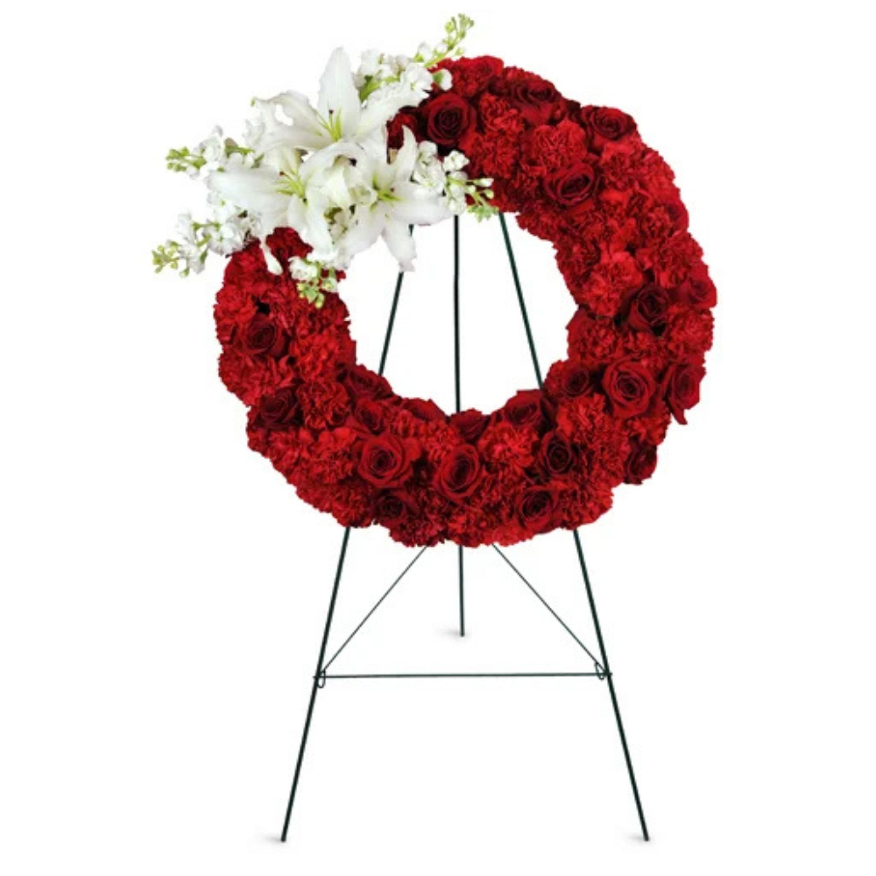 Remember and cherish a beautiful life. Red roses are a traditional way to honor our dearly departed, and this classic wreath will add a special touch as you gather to celebrate your loved one’s memory.