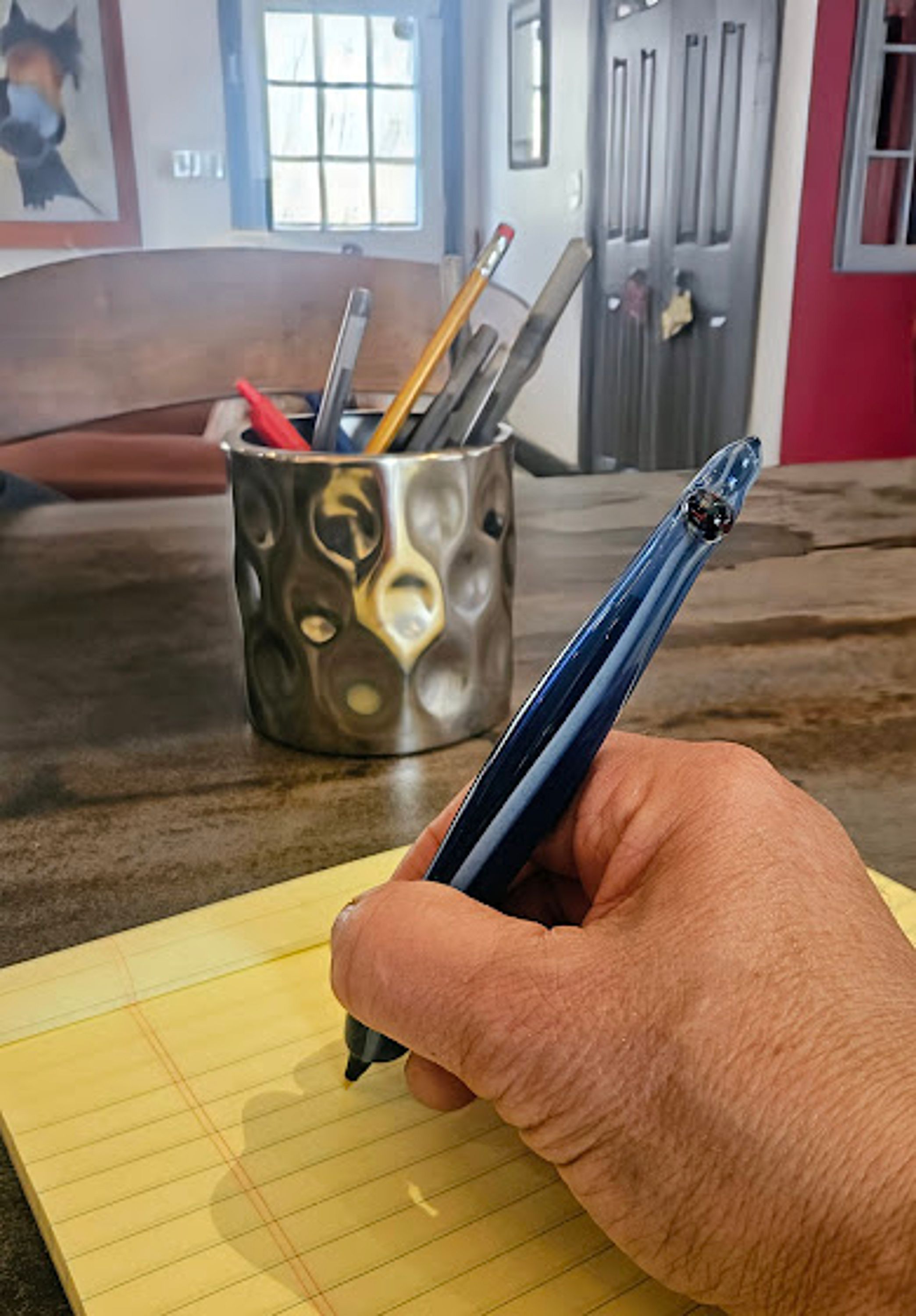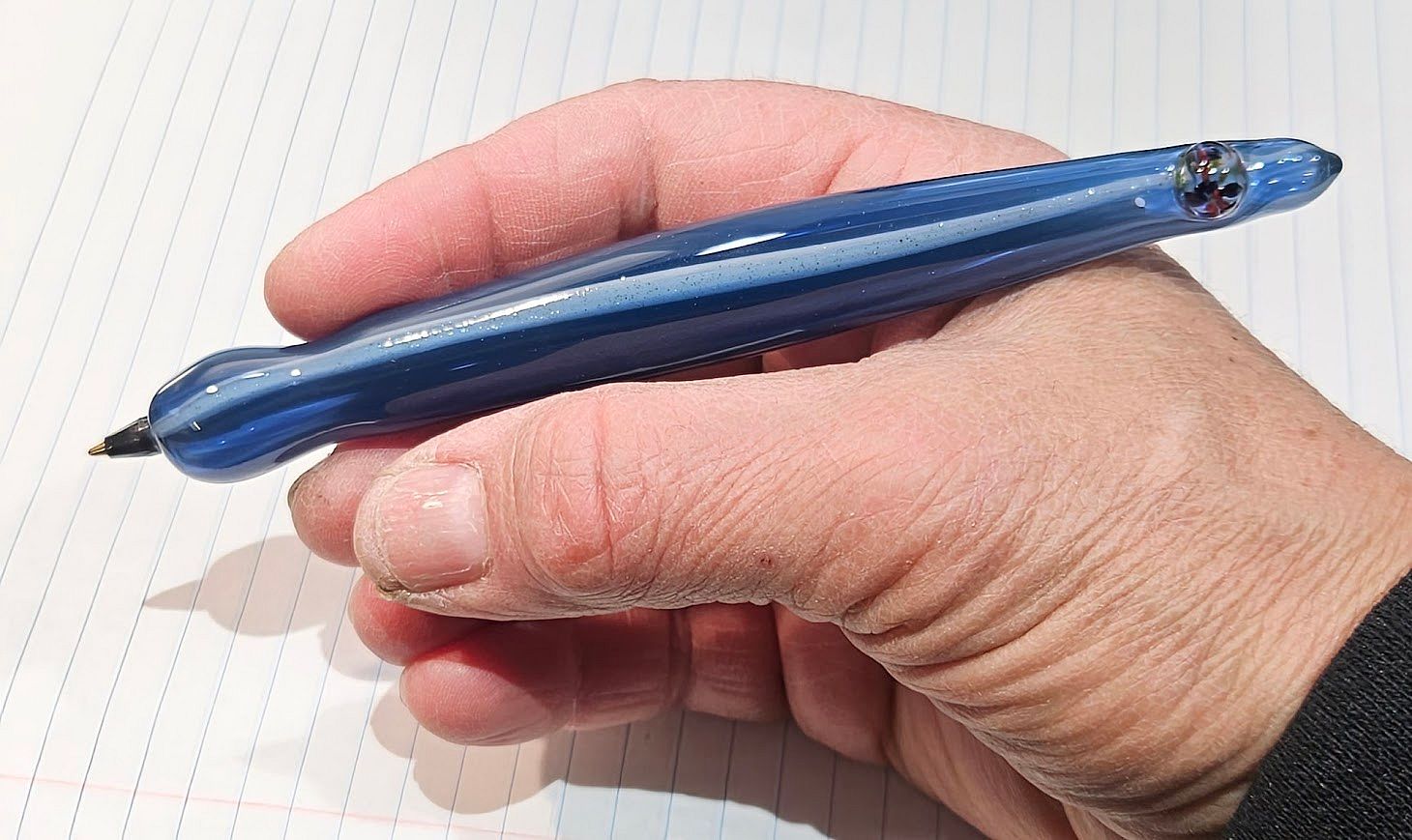 The blown glass pen has blue stripes with some sparkles. It is approximately 6 inches long. It has a multi color murrini to prevent it from rolling off the table. It has a tiny relief hole to allow ink to flow when writing. One refill is included. Any standard disposable pen insert will fit. Grasp insert with pliers and pull out and press a new one in. The refill is held in place by tension.