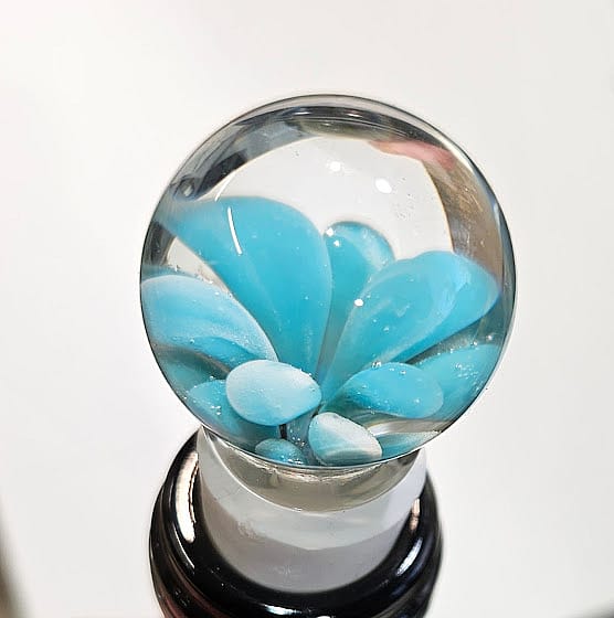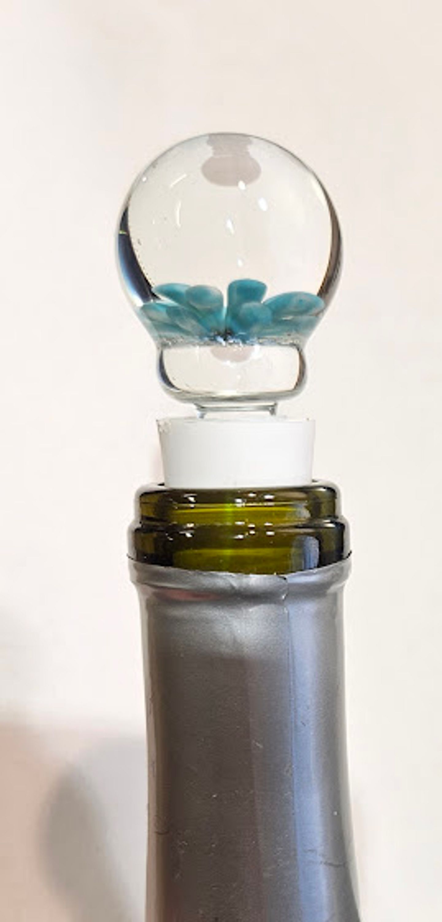 Hand-sculpted light blue glass bottle stopper. It measures 2.75 inches tall and 28 mm diameter. Stoppers make great hostess/gifts and can be given with decorative olive oil or wine bottles. A size 2 stopper tapers to fit in standard wine and olive oil bottles. It tapers 20 to 16 mm. The cork can be removed and replaced as needed over time. Either cut or wet and twist off and press on a new one. Make sure to wet the bottom to press a replacement cork on.