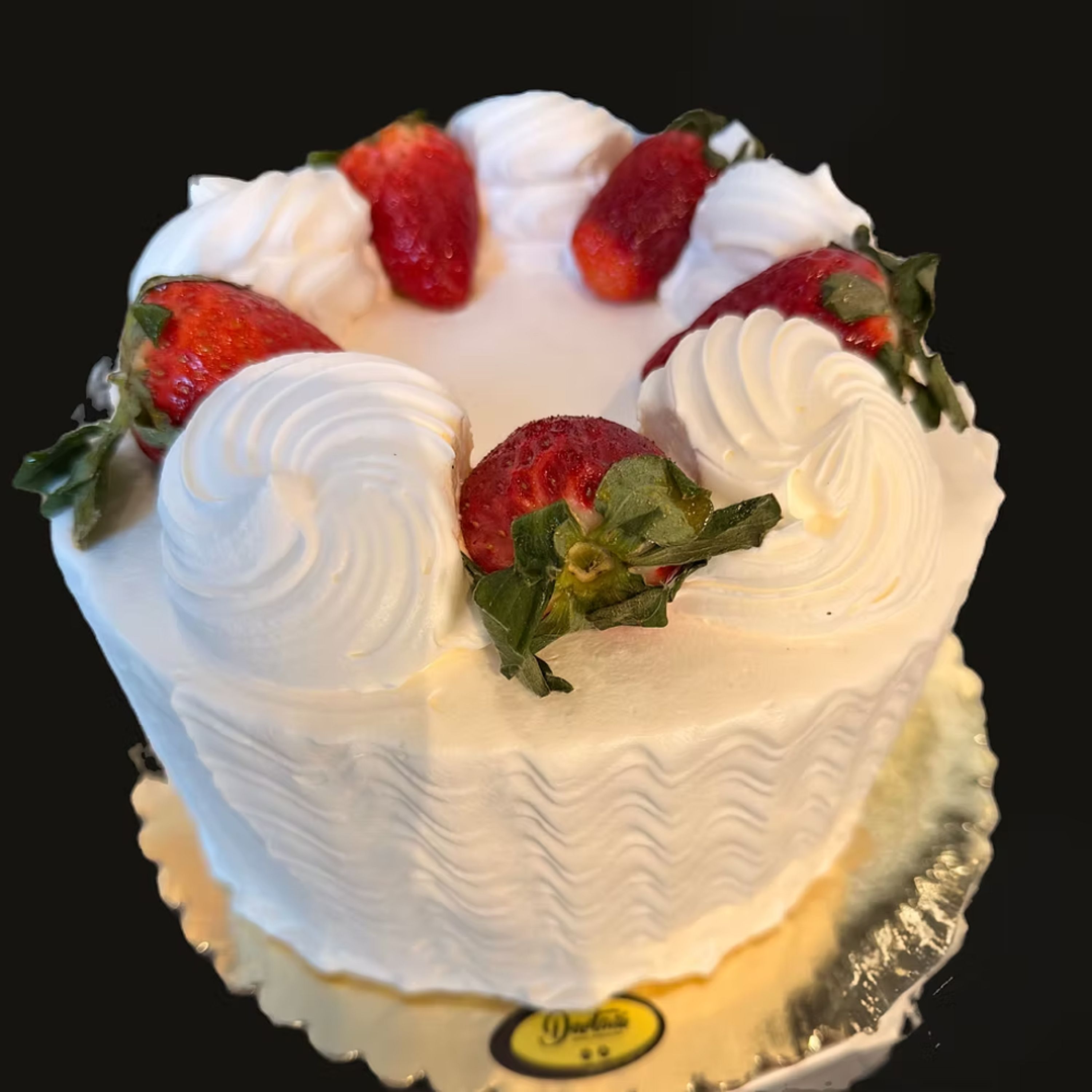 Vanilla cake layered with sweet strawberry filling and finished with fresh whipped cream. 7-Inch Whipped Cream Cake Feeds 9-11 people
