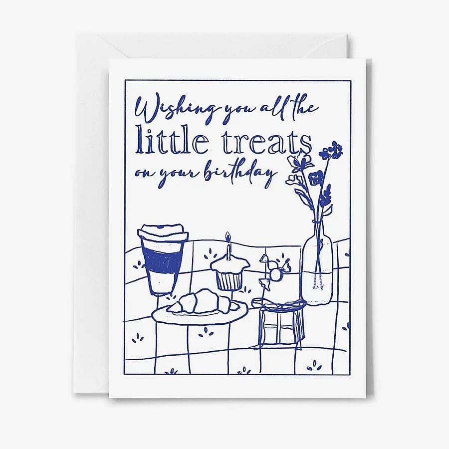 A stylish card with a blue and white template design, featuring the message “Wishing You All the Little Treats on Your Birthday,” perfect for celebrating with charm, sweetness, and cheerful birthday wishes