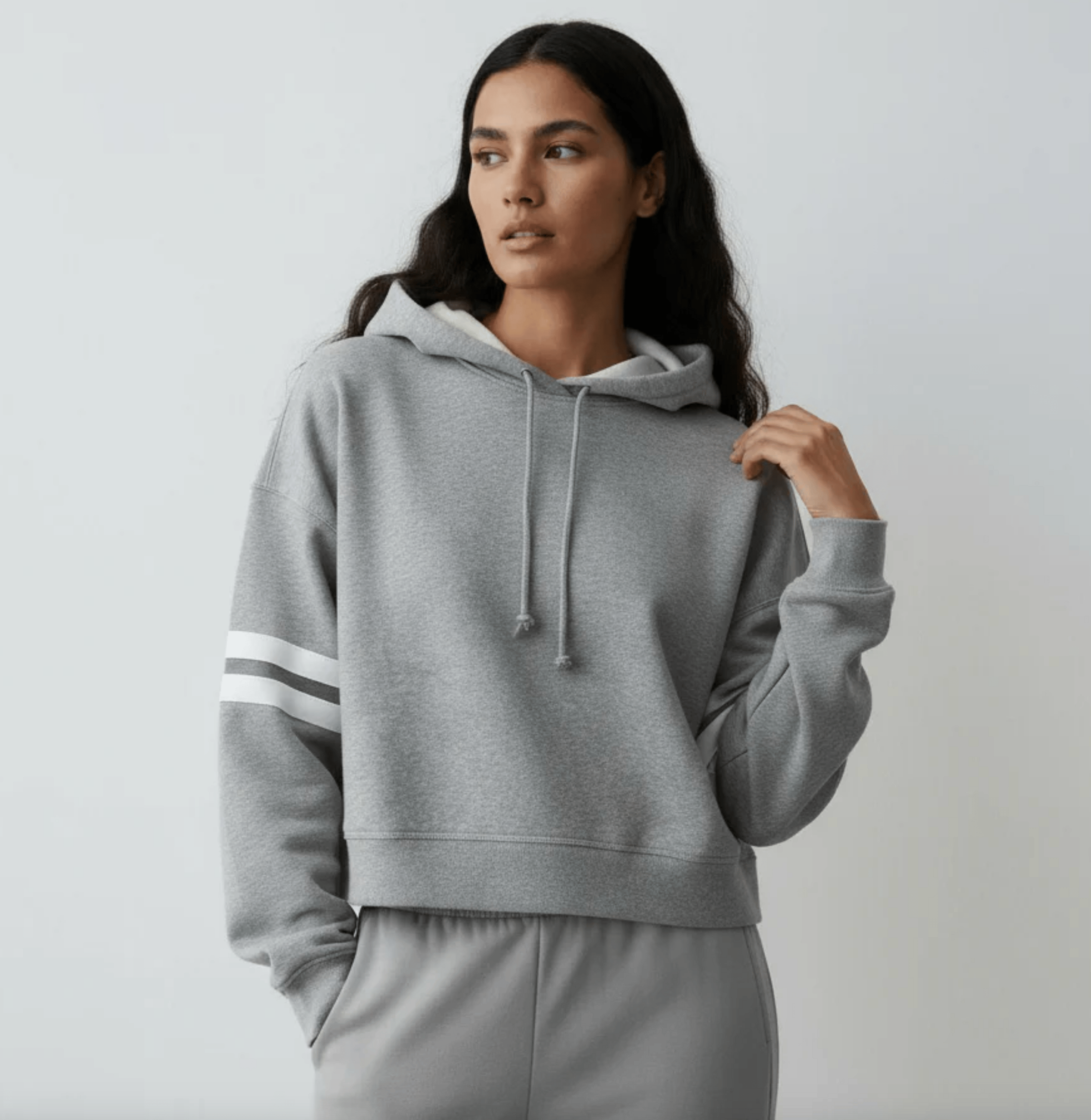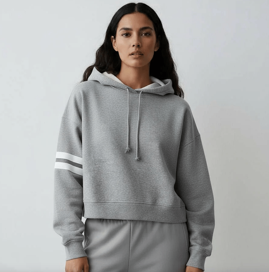 The CC Women's Varsity Crop Hood features heathered midweight cotton fleece and a cropped fit, complete with varsity stripe detailing on the sleeve.