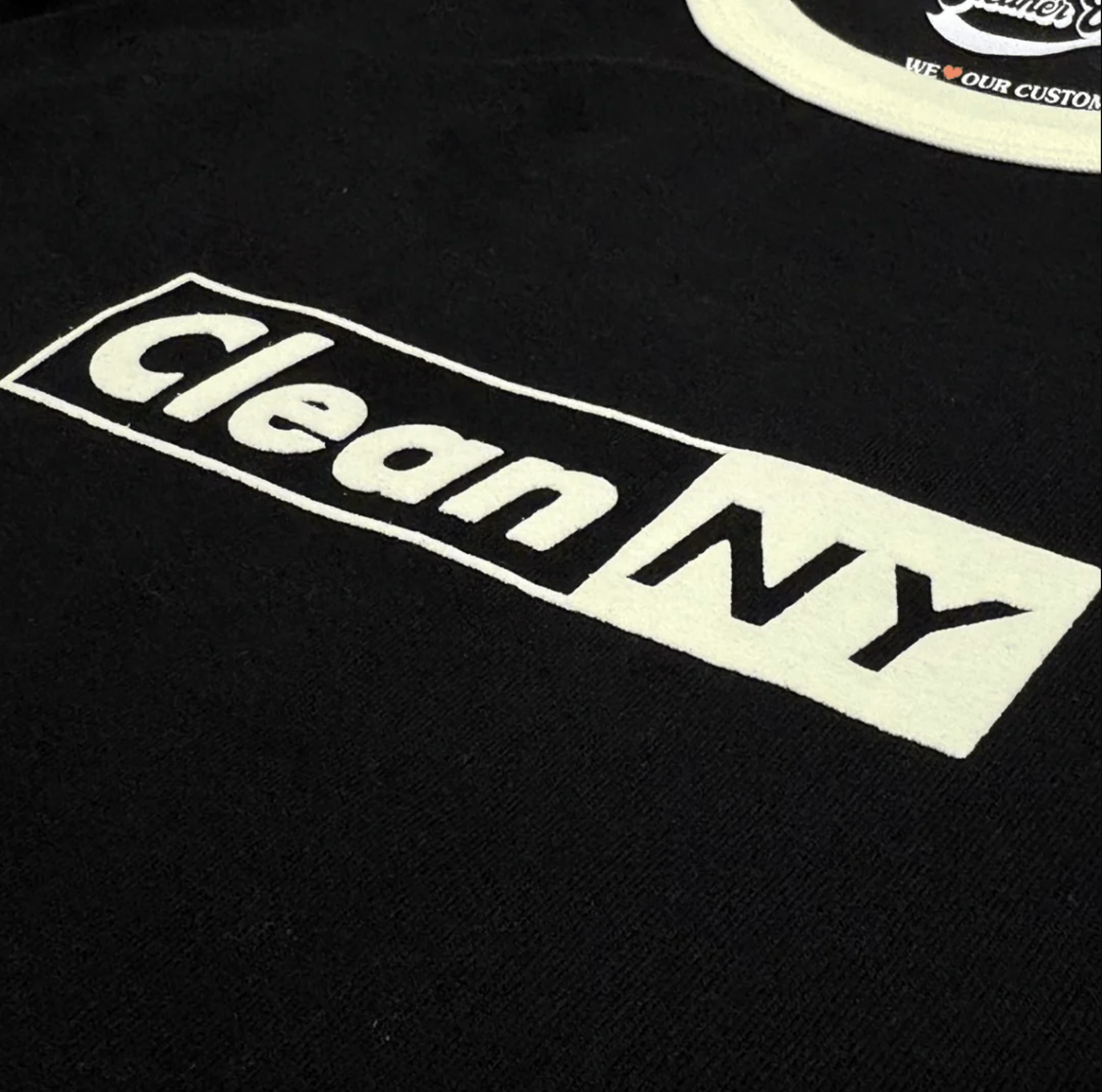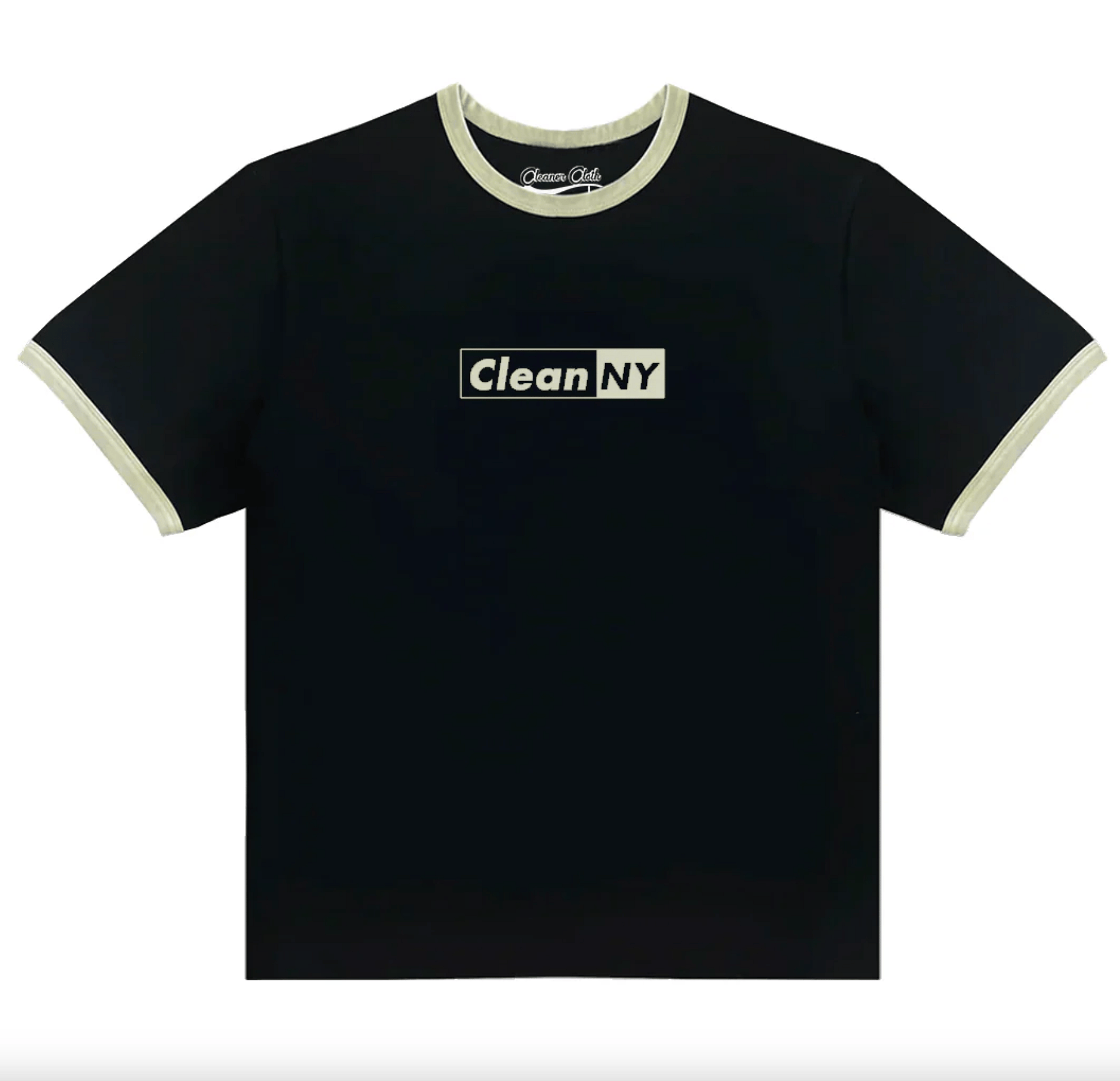 A classic staple, this regular fit luxury ringer tee features a throwback ecru puff print. Pre-washed super soft cotton with 2x1 contrast ribbing. Made in Italy. Exclusive to The Cleaners.