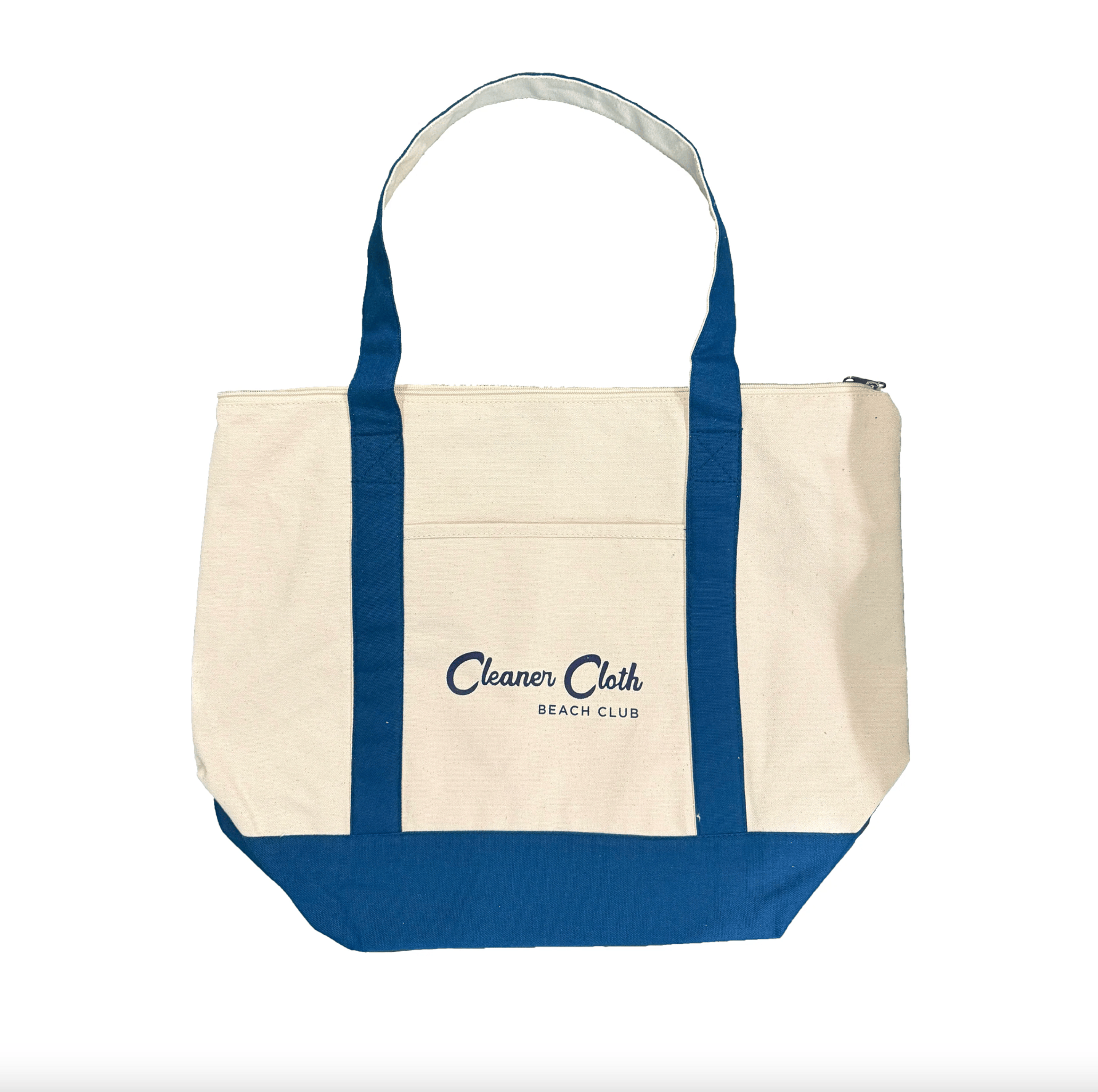 This heavyweight canvas tote features a bold blue base, contrast straps, and our Cleaner Cloth Beach Club logo front and center. With a roomy main compartment, outer pocket, and secure zip closure, it carries all your essentials.