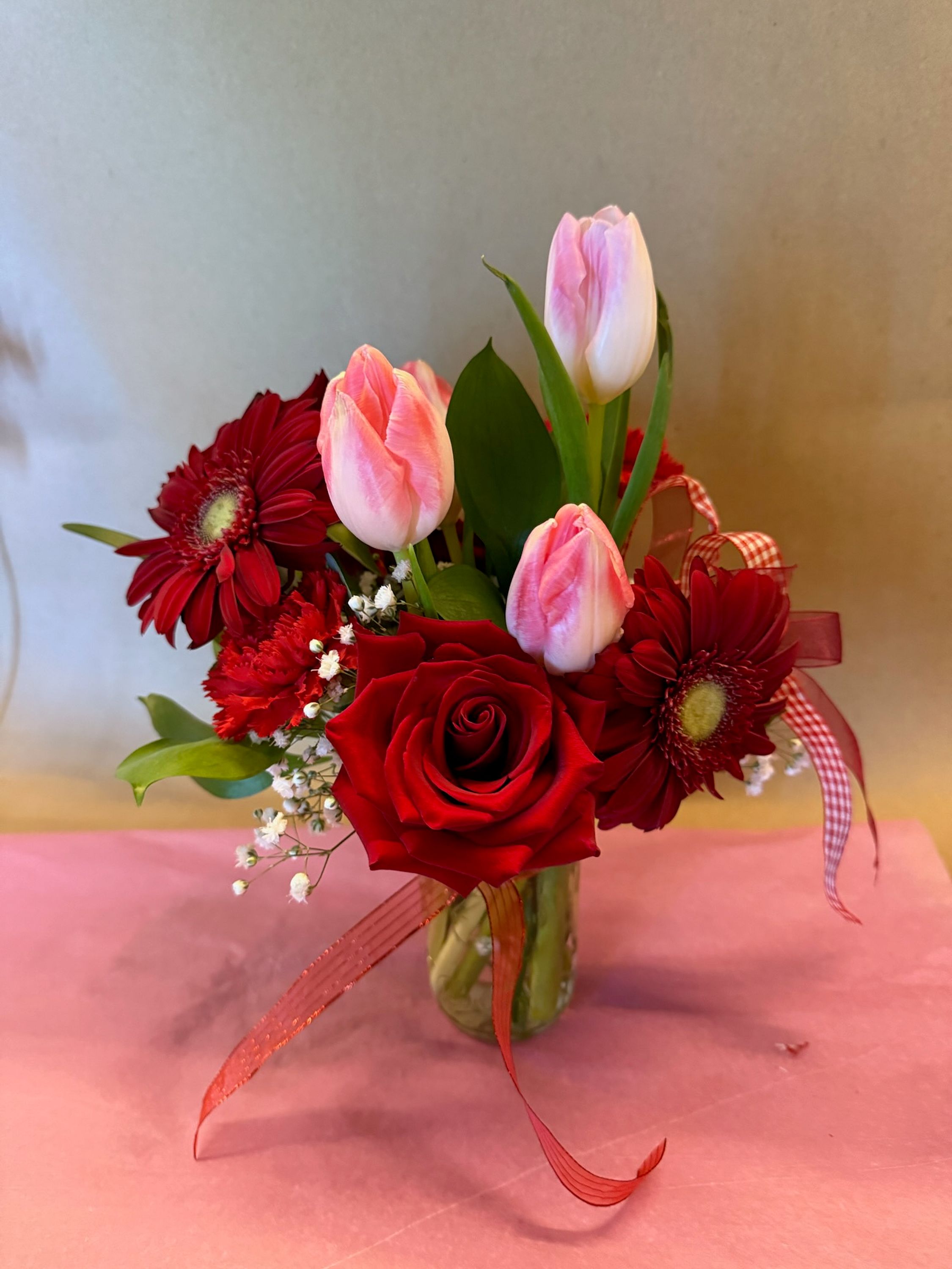 A sweet and simple way to brighten someone’s day. This charming bud vase arrangement features a clear glass vase filled with 2–3 fresh seasonal blooms, thoughtfully accented with greenery and delicate filler flowers.