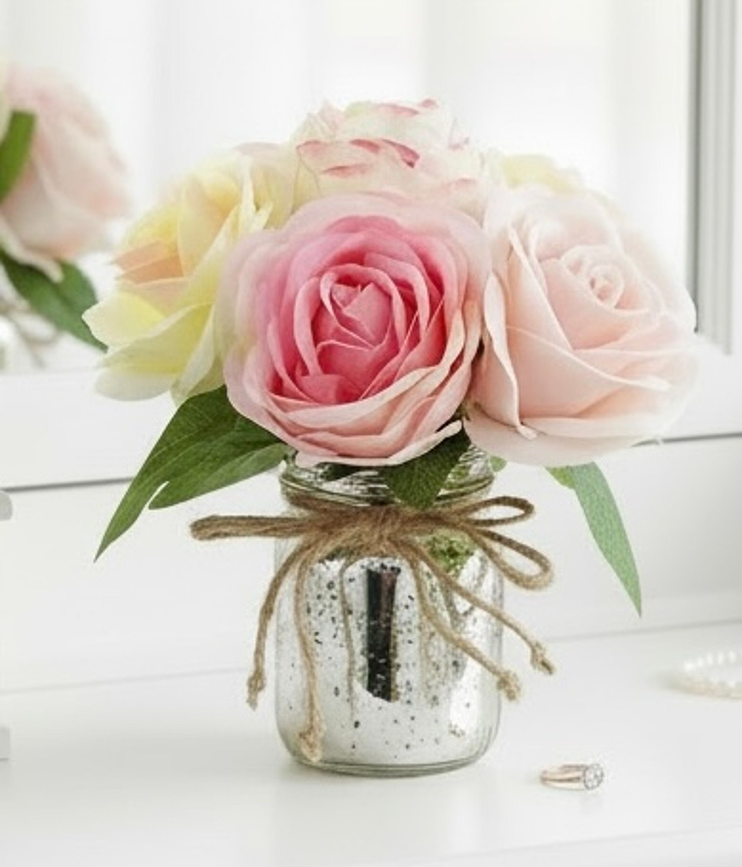 This boutique floral is made with beautiful high quality silk flowers including roses peonies and ranunculus. It sits in a stunning Mercury glass jar and is finished with a twine bow.